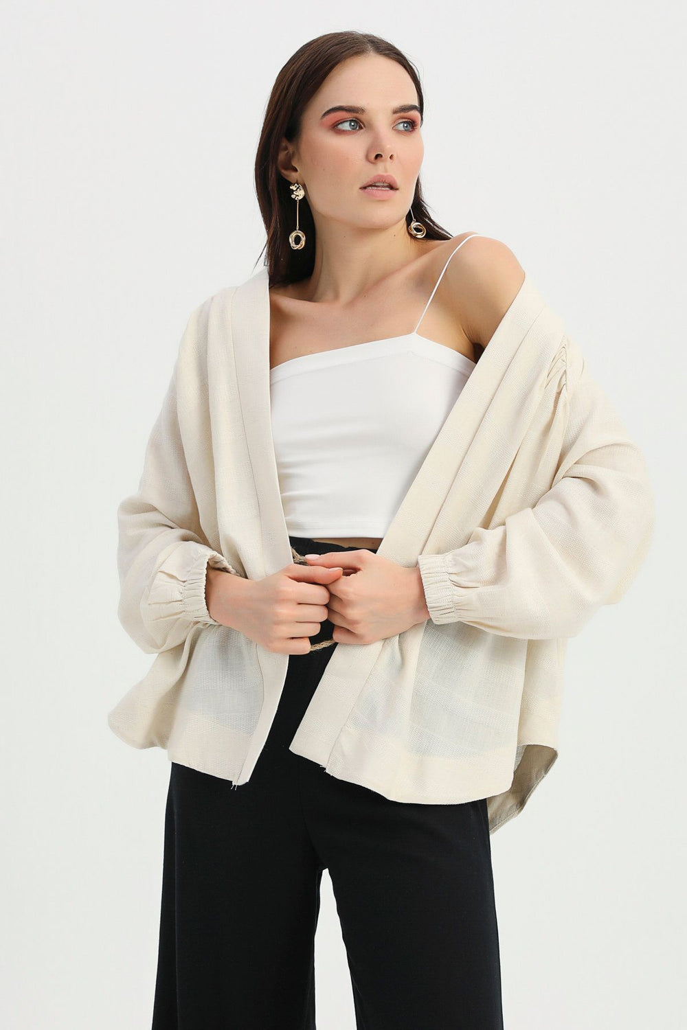 Arkası Nakışlı Kuşaklı Keten Ceket Naturel