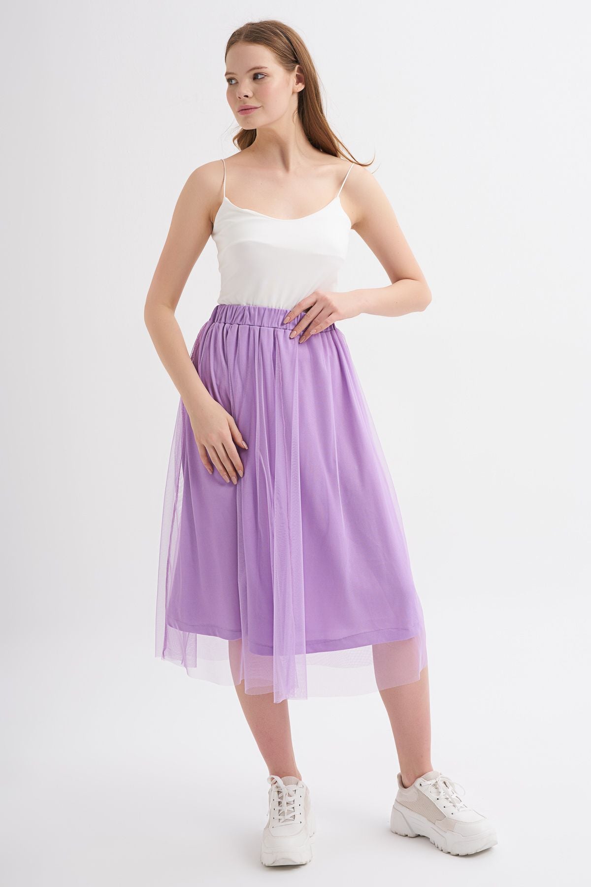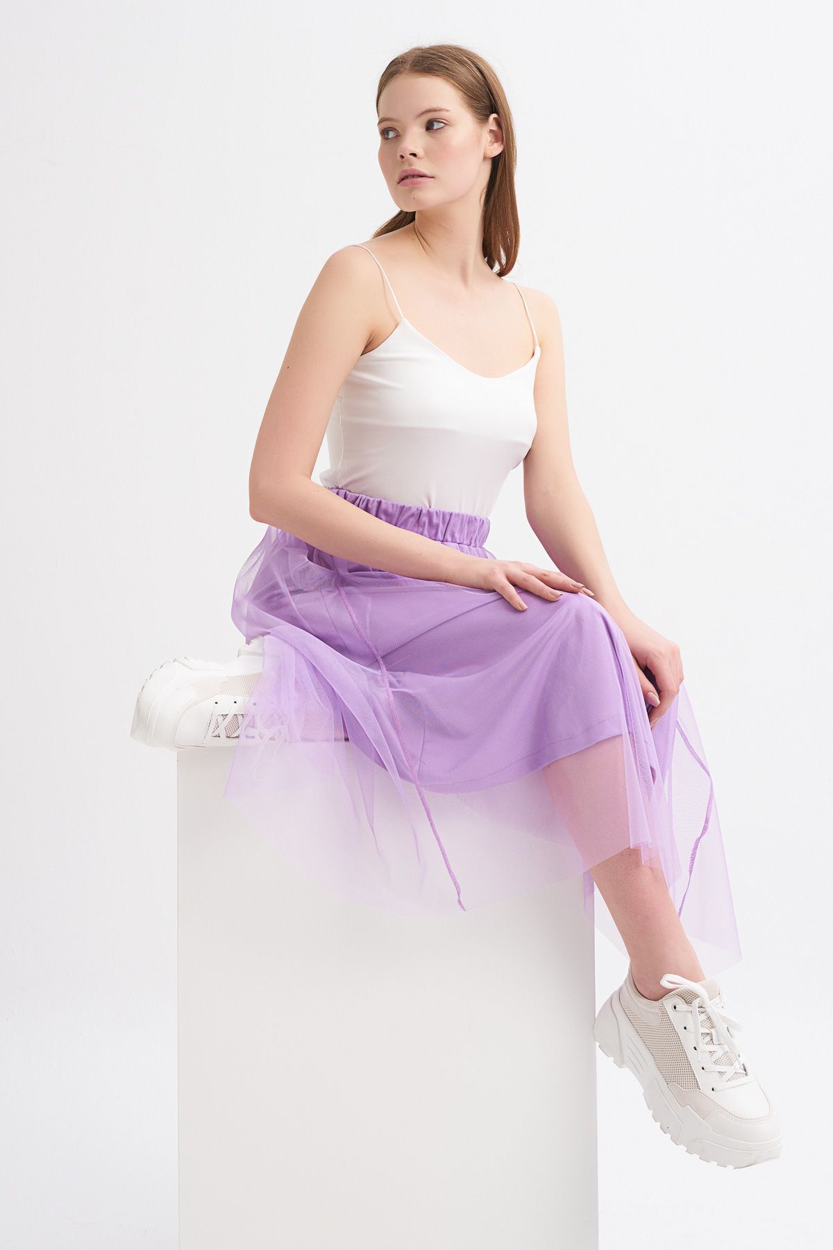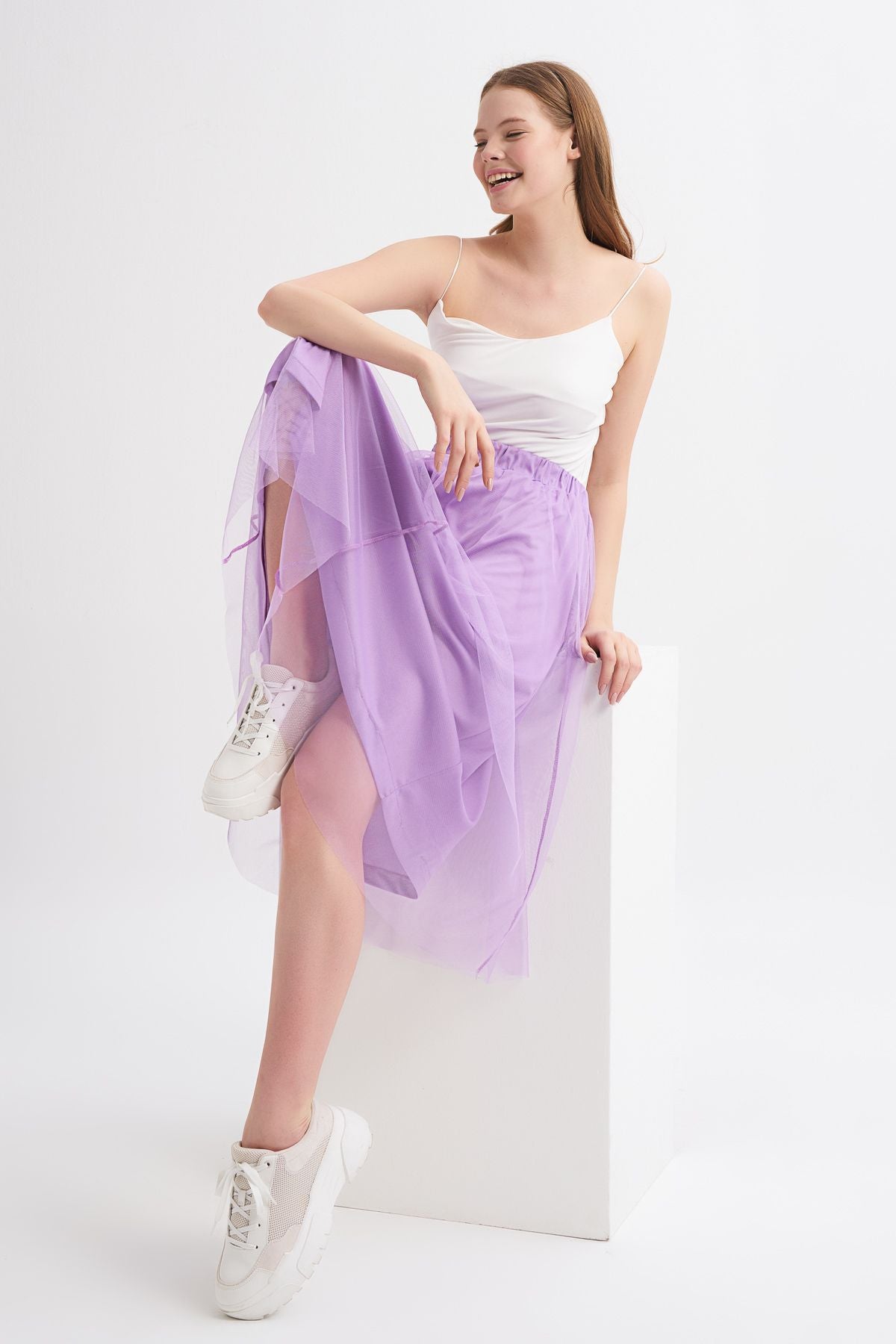 Özenli tarzının özel parçalarından birisi olacak piliseli midi boy tül detaylı eteği, ince bantlı topuklu ayakkabılar ile tamamlayarak zariflik dozunu artırabilirsin.