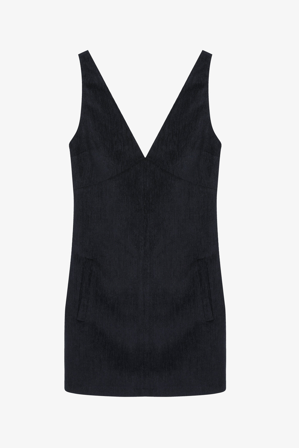 Cep Detaylı Yuvarlak Yaka Tüvit Mini Elbise Siyah