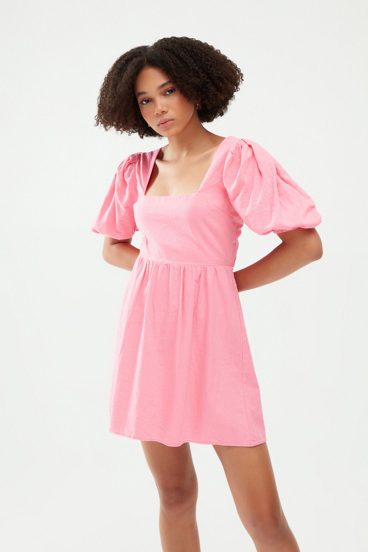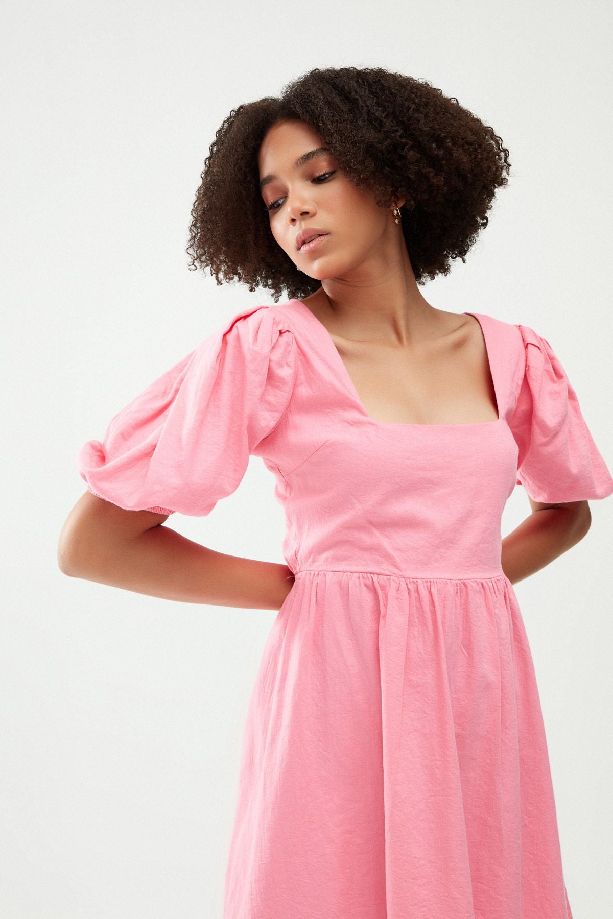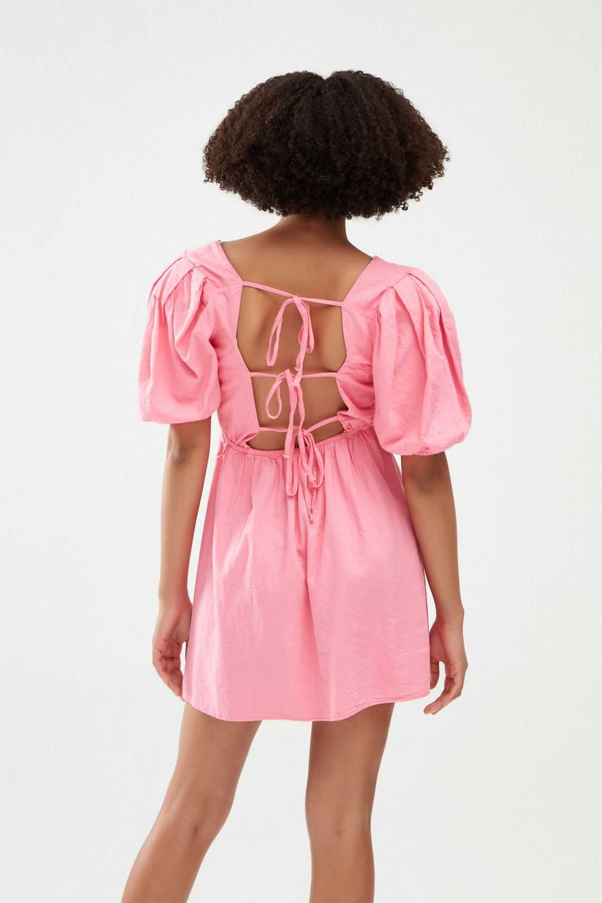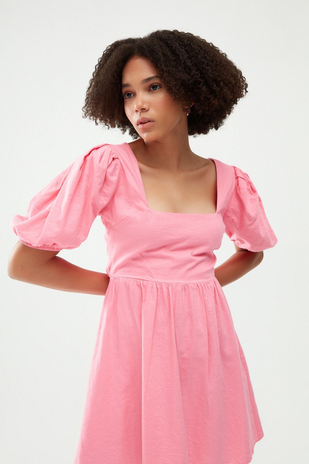 Balon Kol Dekolteli Vatkalı Elbise Şeker Pembe
