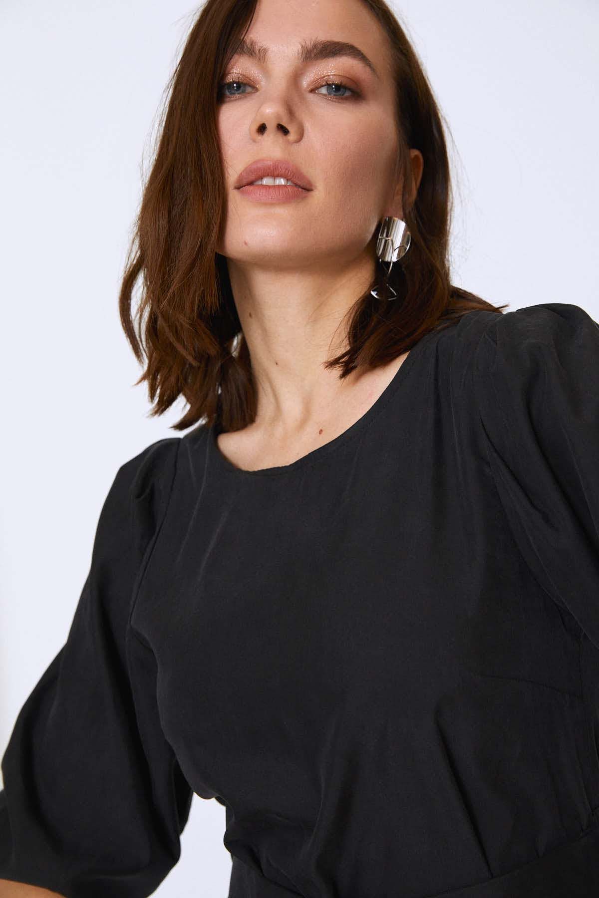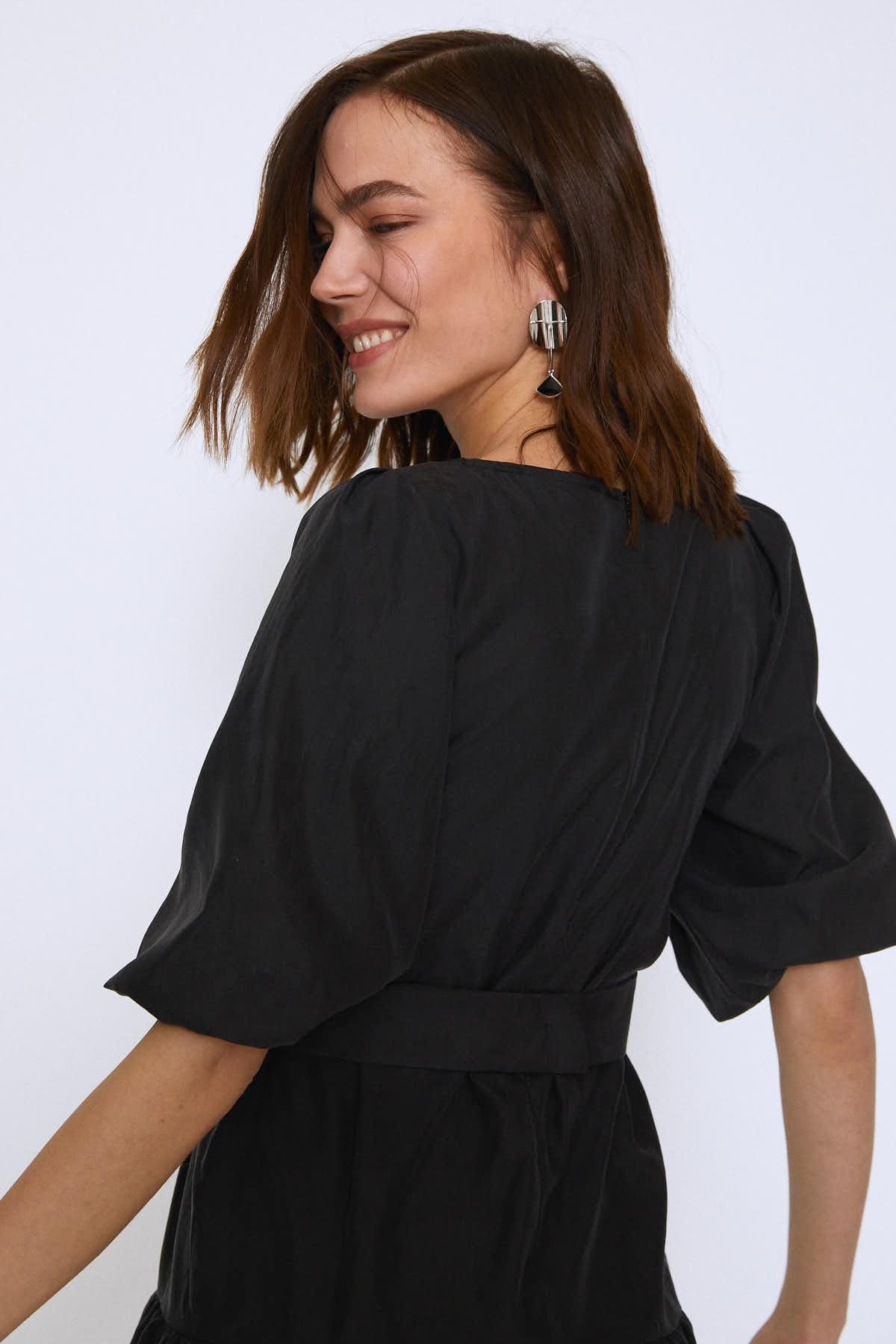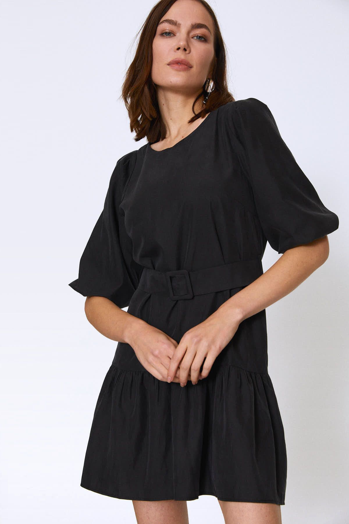 Beli Kemerli Eteği Fırfırlı Elbise Siyah