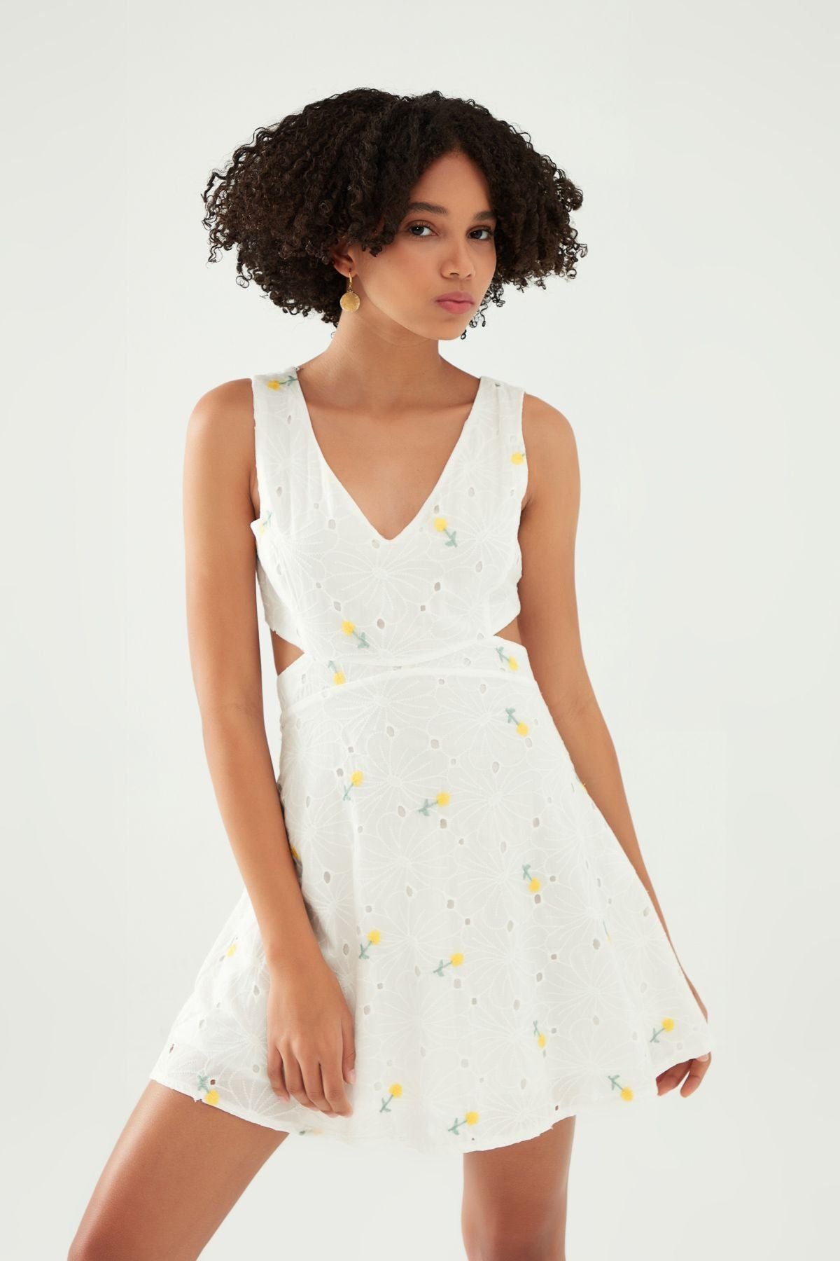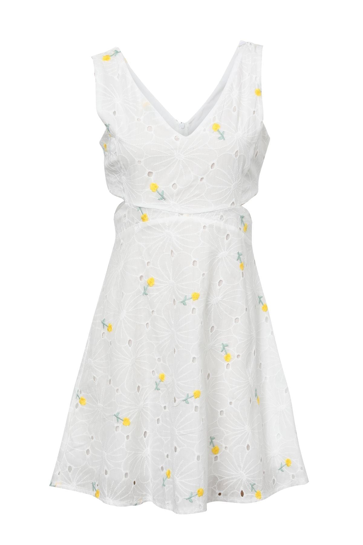 Çiçekli Dekolte Detaylı Mini Elbise Beyaz
