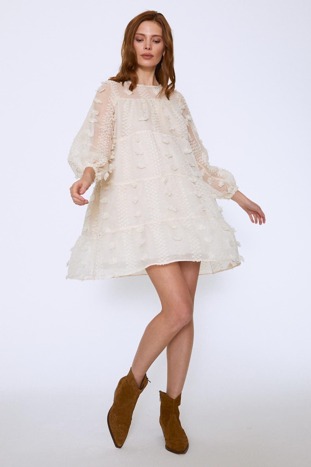 Dantelli Mini Elbise Bej