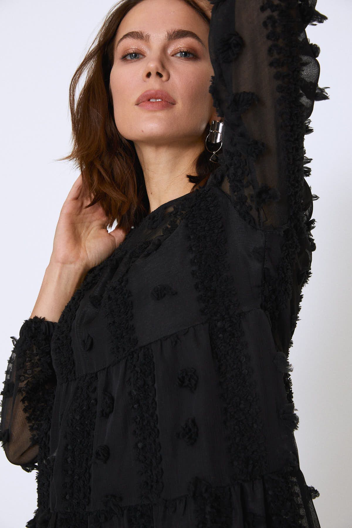 Dantel kumaşı mini elbise zarafeti ile birleştiren tasarım, dolabında yerini alsın. Günün her anında tarzını daha güçlü kılacak elbiseni kısa botlarla kombinleyebilirsin.