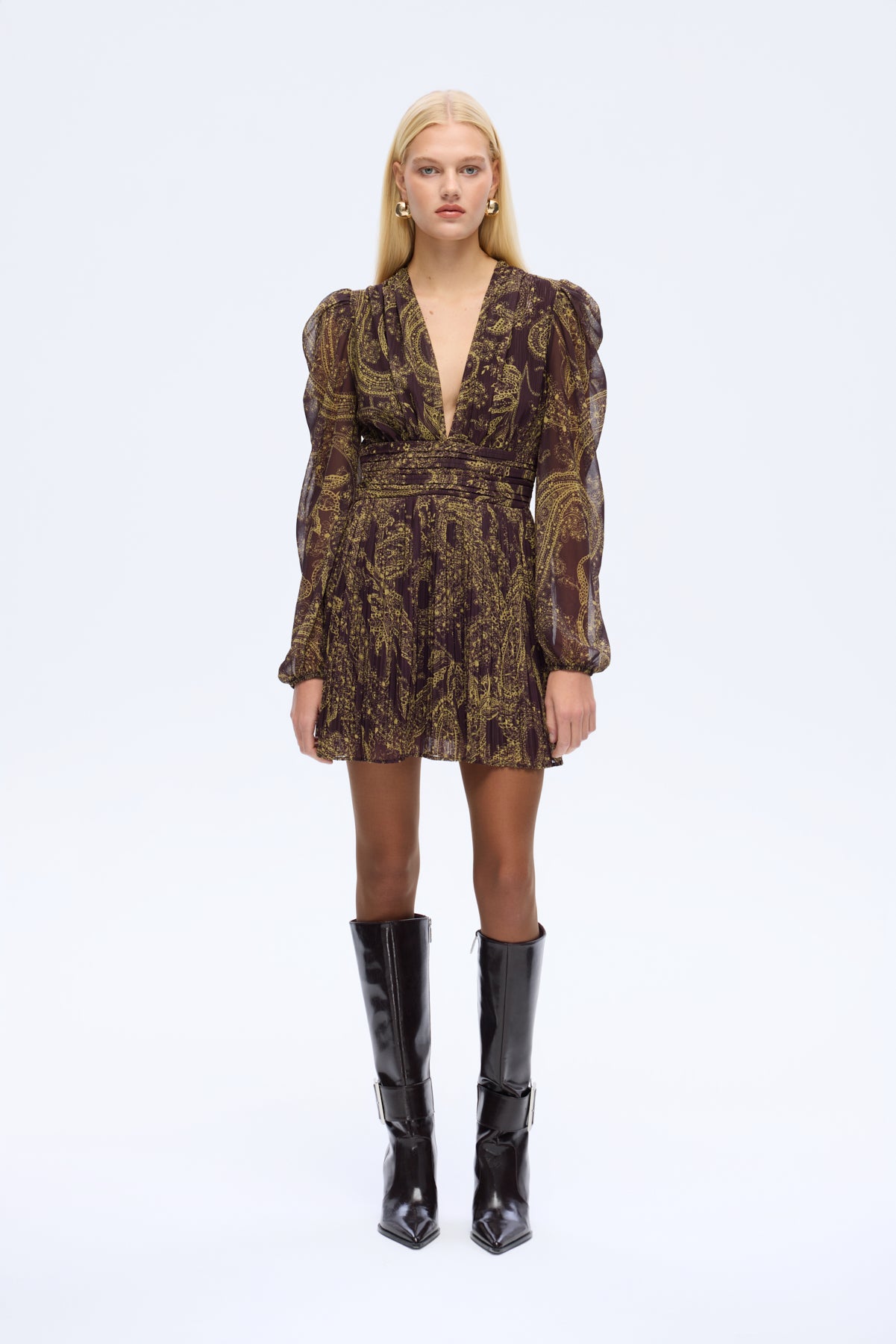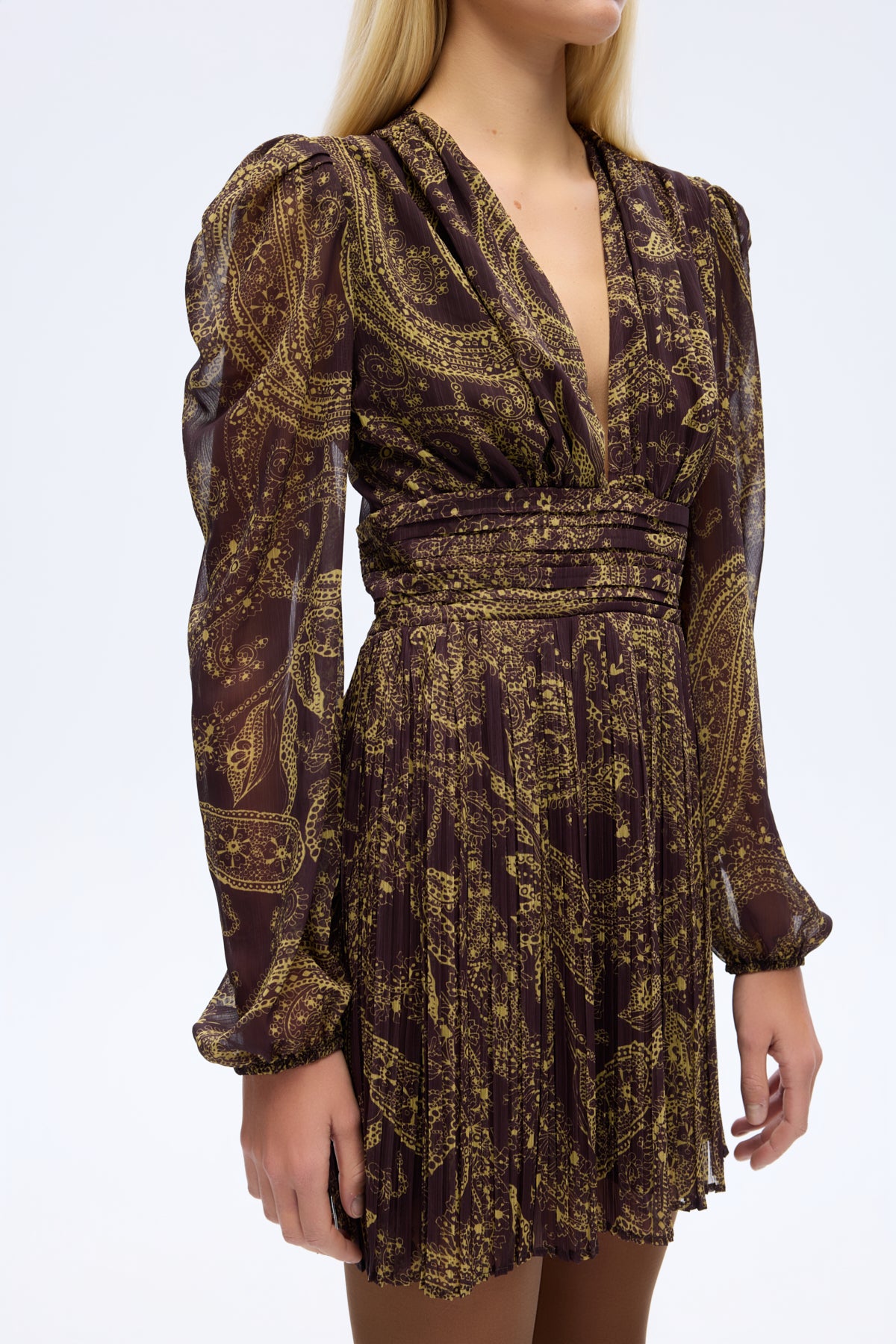 İçi kendi renginden astarlı, v yaka, uzun kollu, belden büzgülü, desenli, pileli, yandan fermuar kapamalı, mini boy elbise.