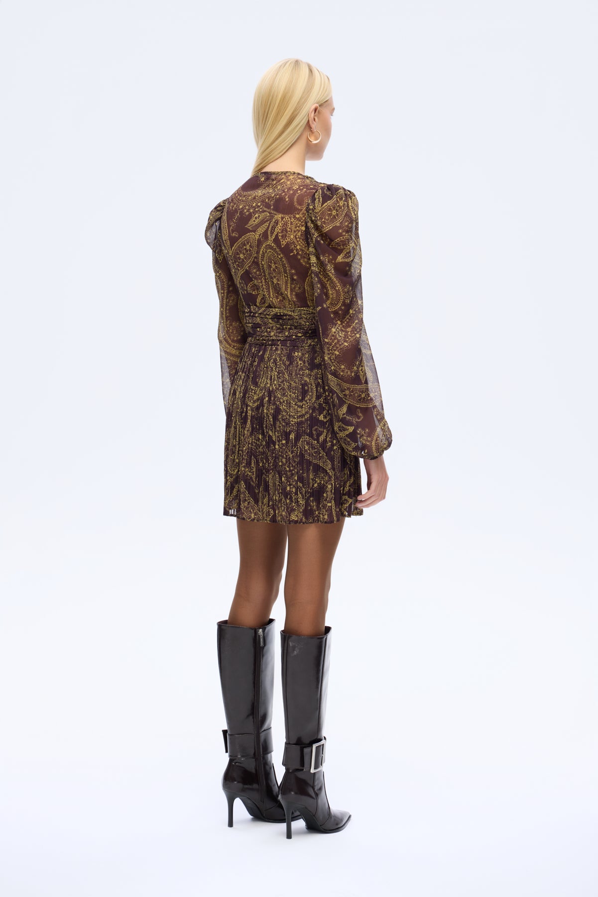 Desenli Piliseli V Yaka Mini Elbise Kahverengi