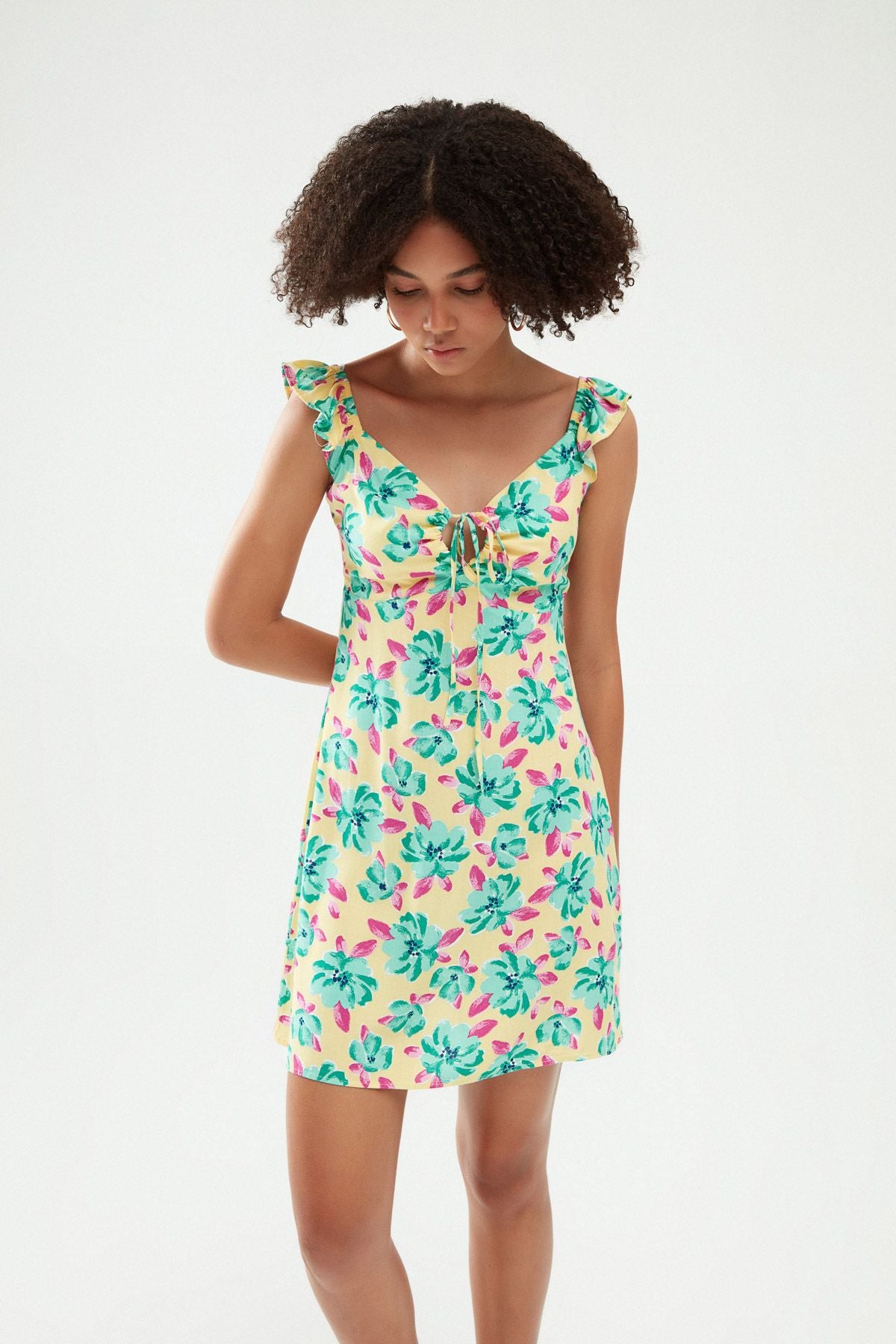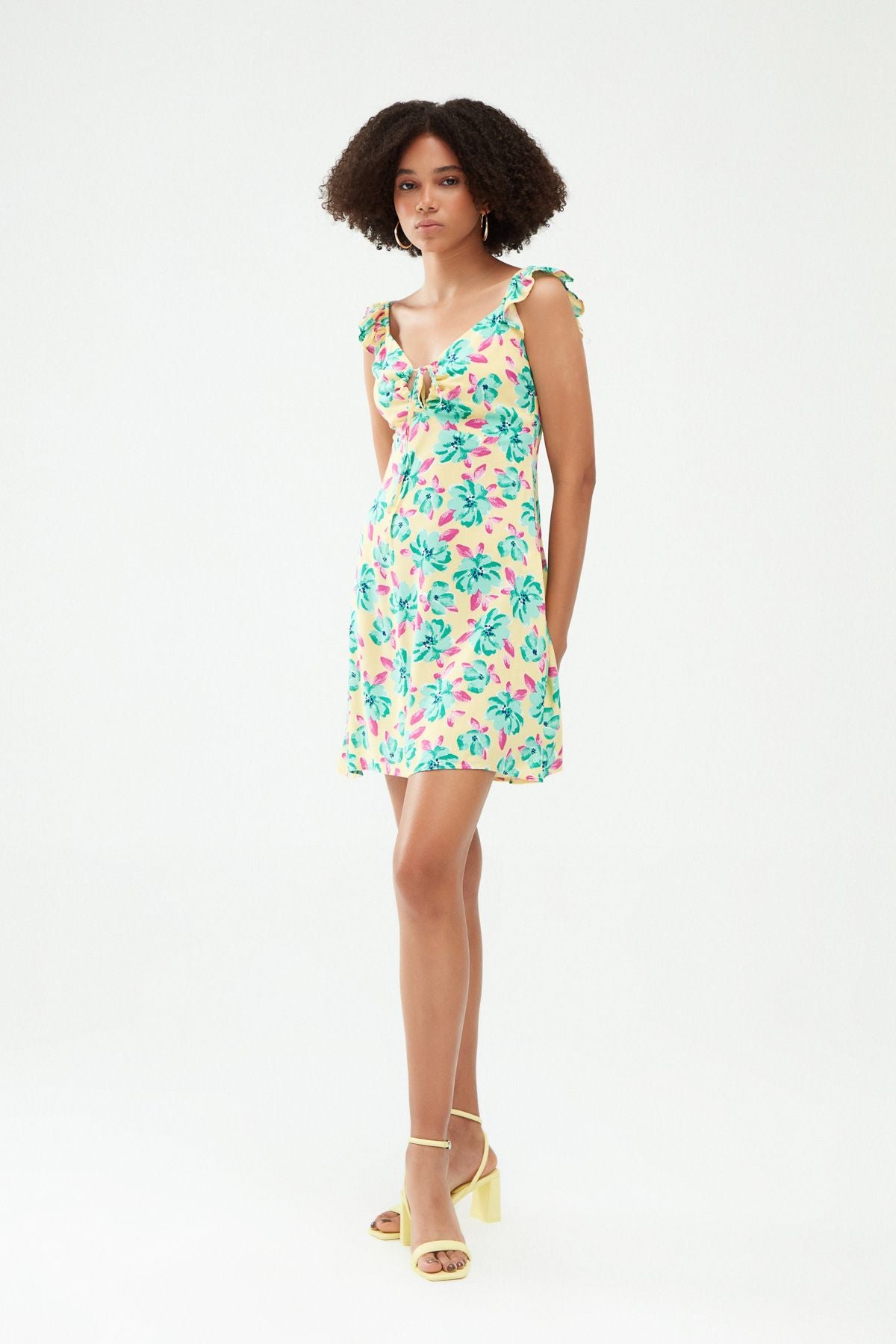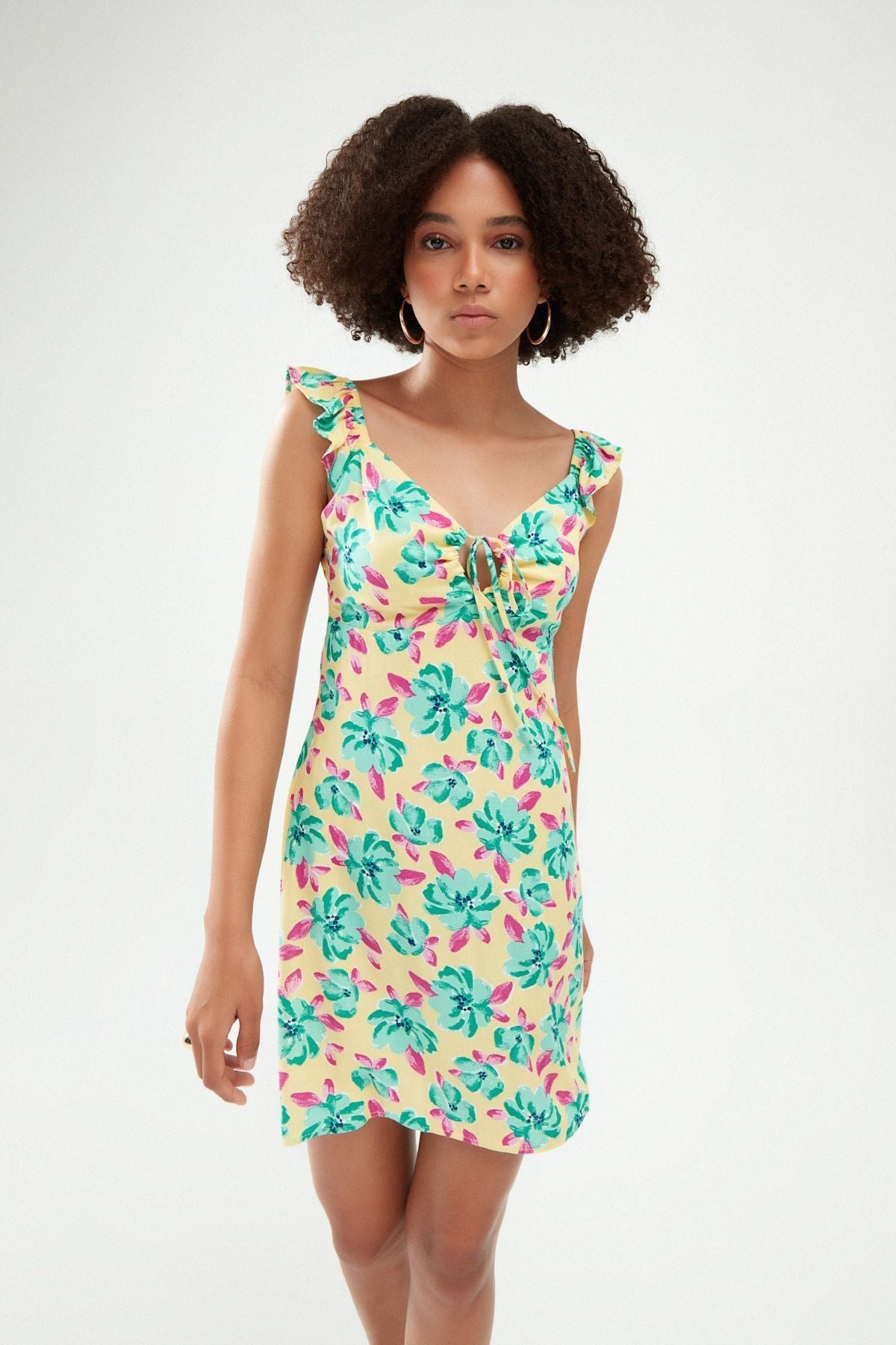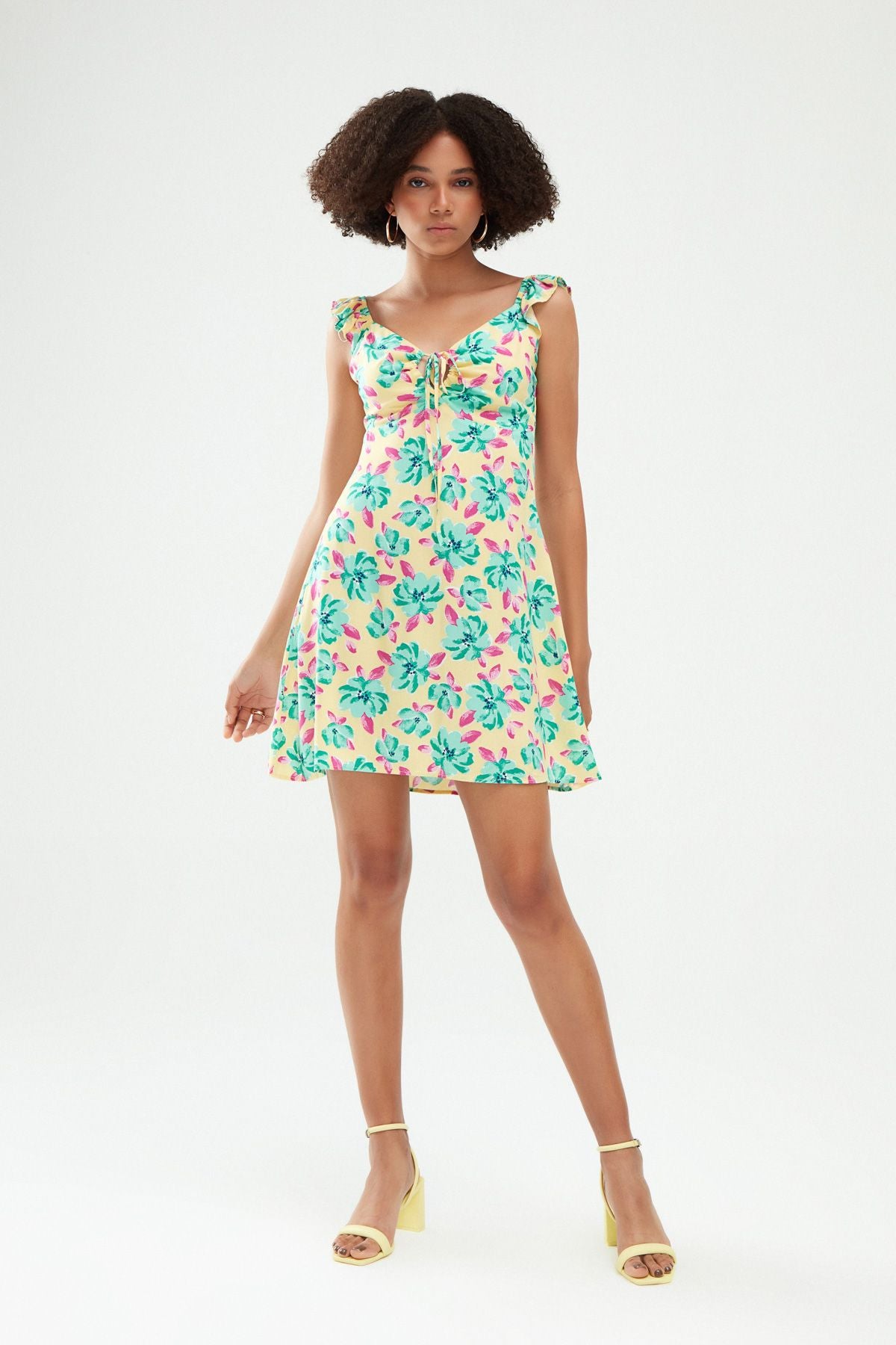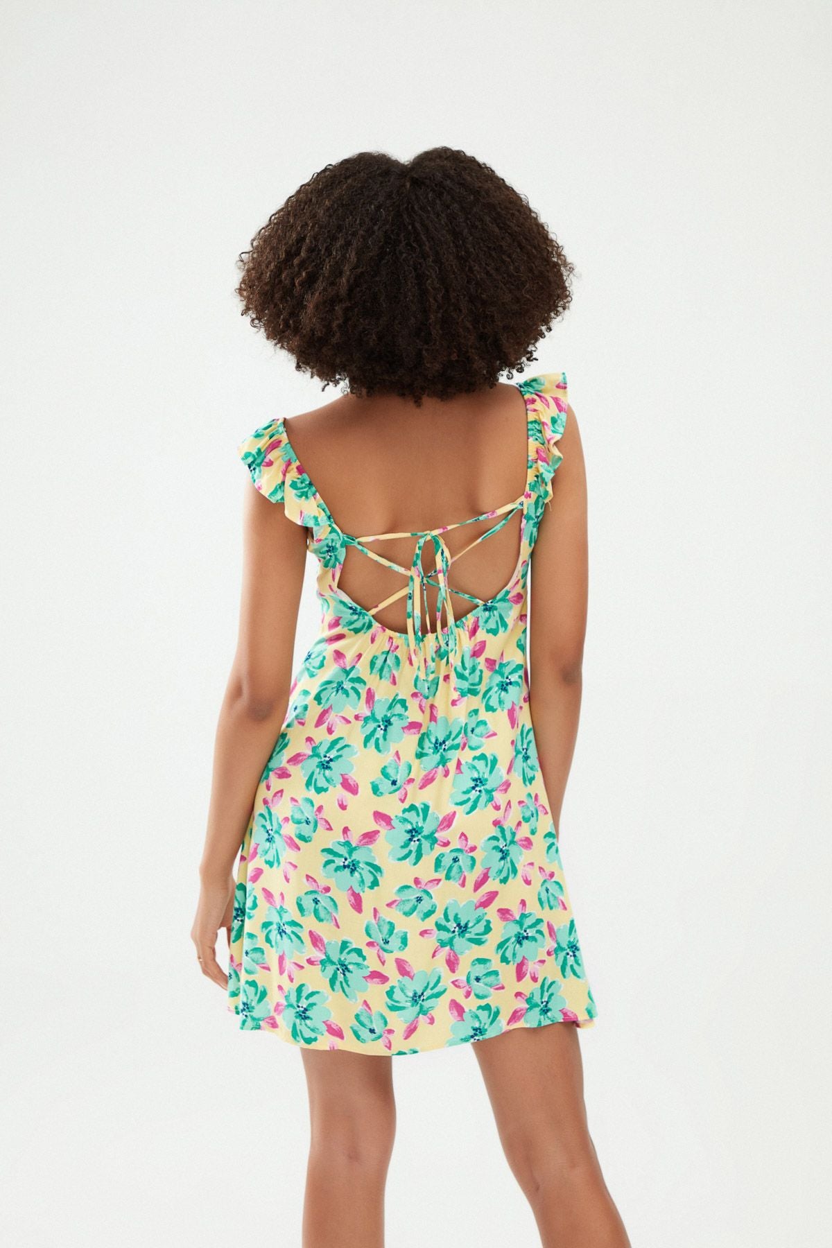 Desenli Sırt Dekolteli Mini Elbise Sarı