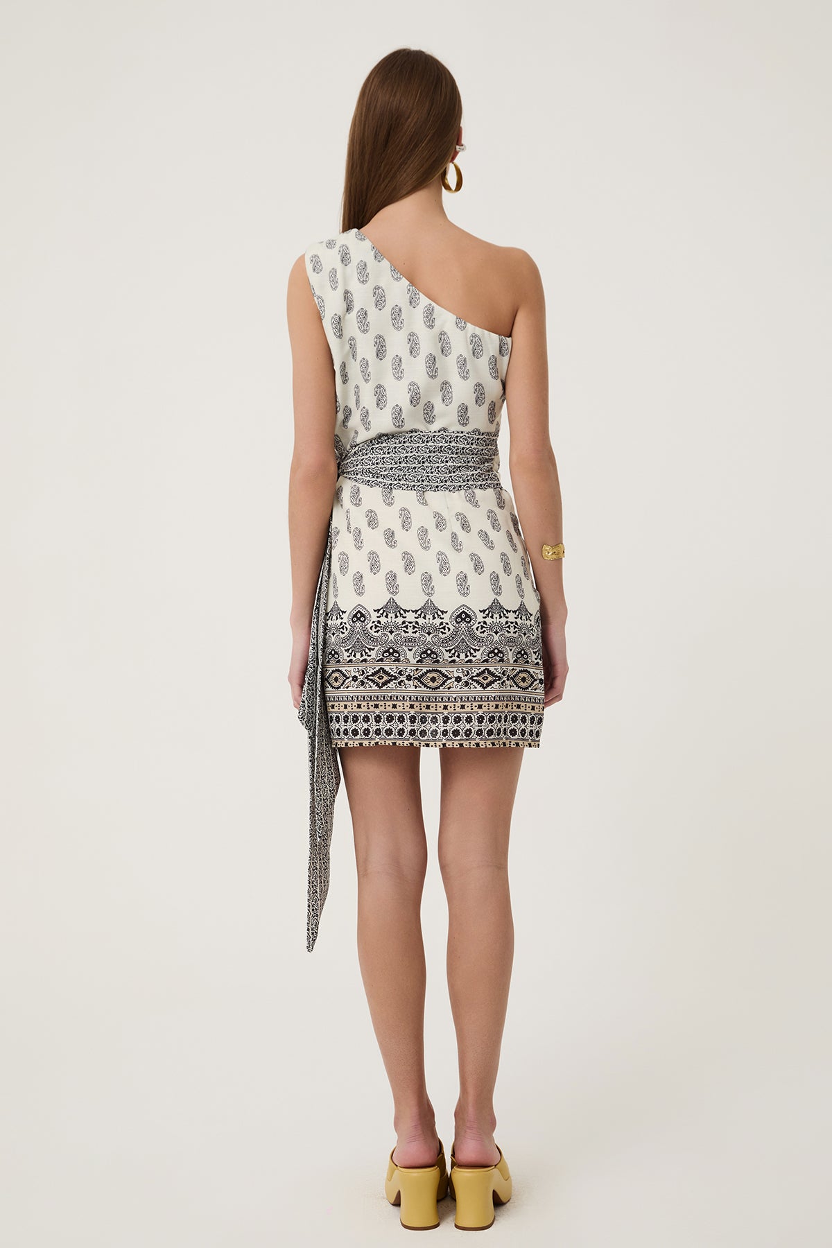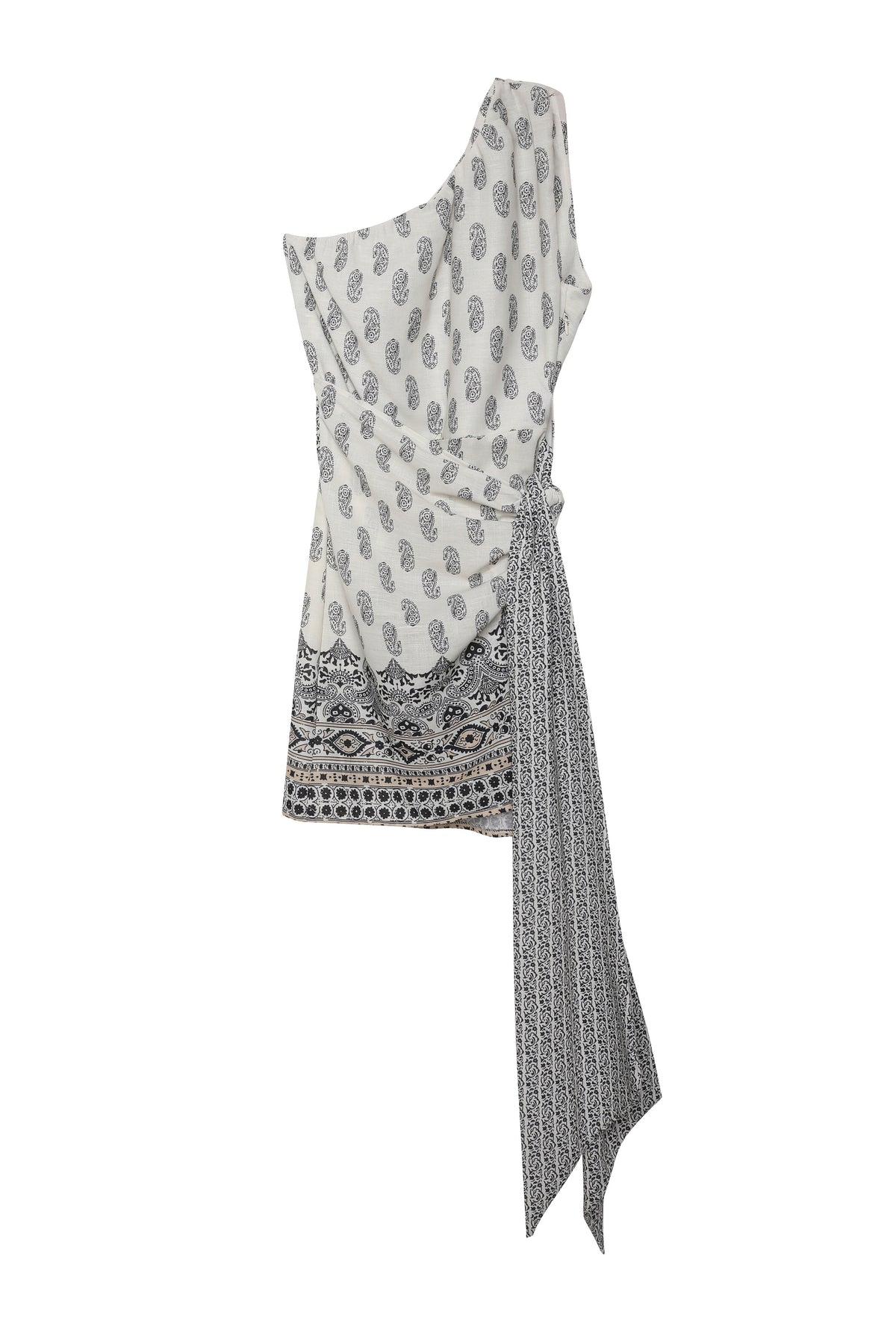 Keten karışımlı,tek omuz, etnik desenli, belden bağlamalı, mini boy elbise.