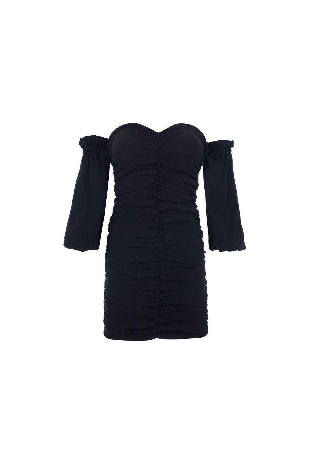 Düşük Kol Büzgülü Elbise Siyah