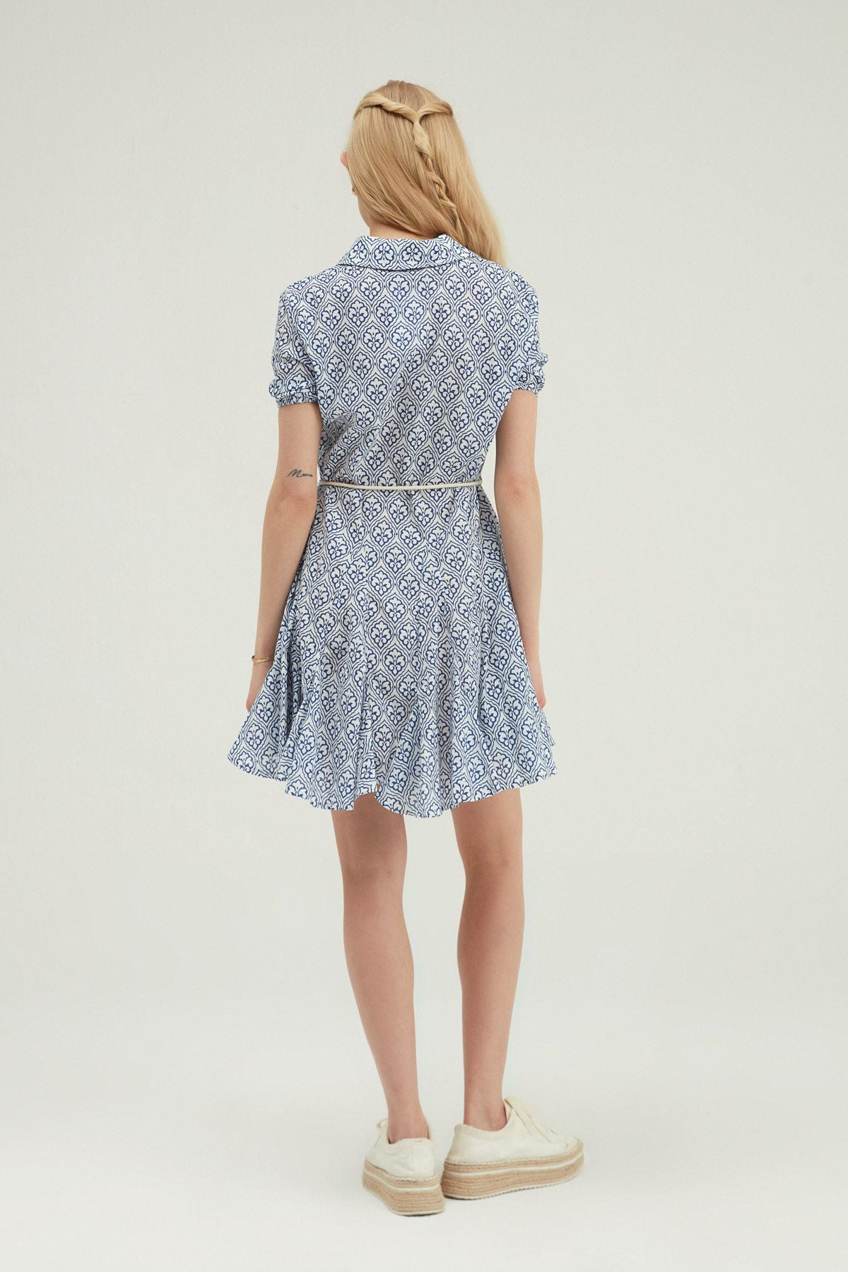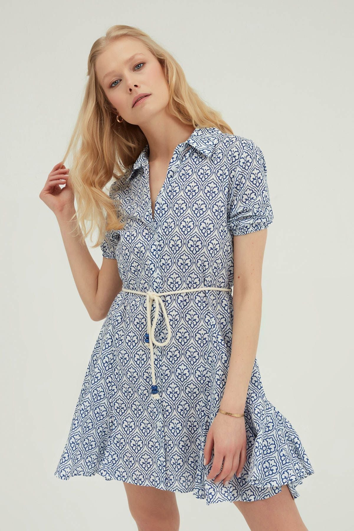 Gömlek Yaka Volanlı Mini Elbise Mavi