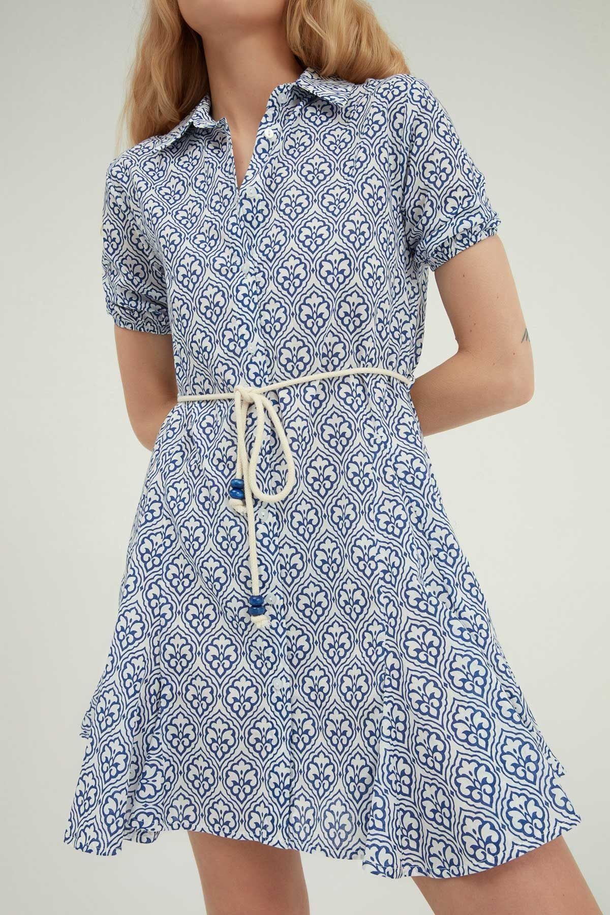 Manşetleri lastikli detaylı, beli çıkarılabilir kuşaklı pamuklu gömlek elbise size desen şöleni yaratıyor.