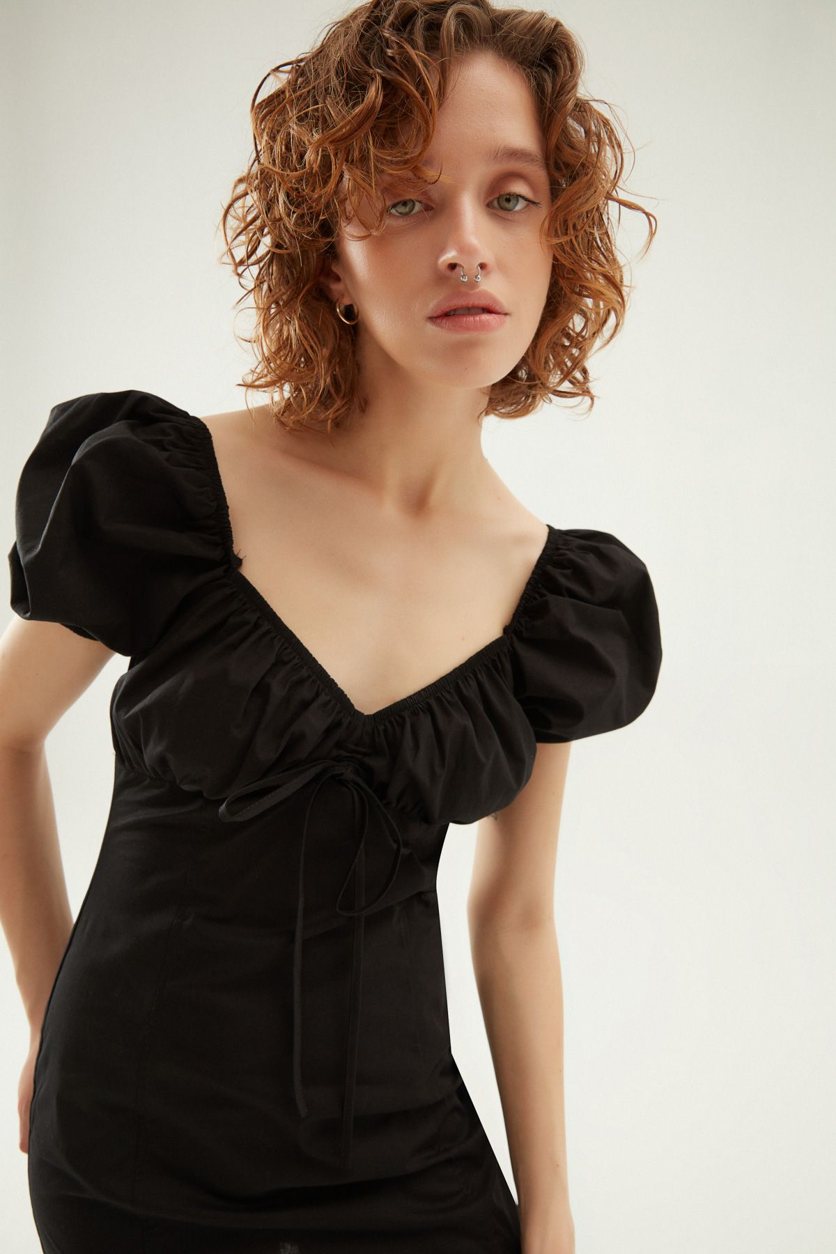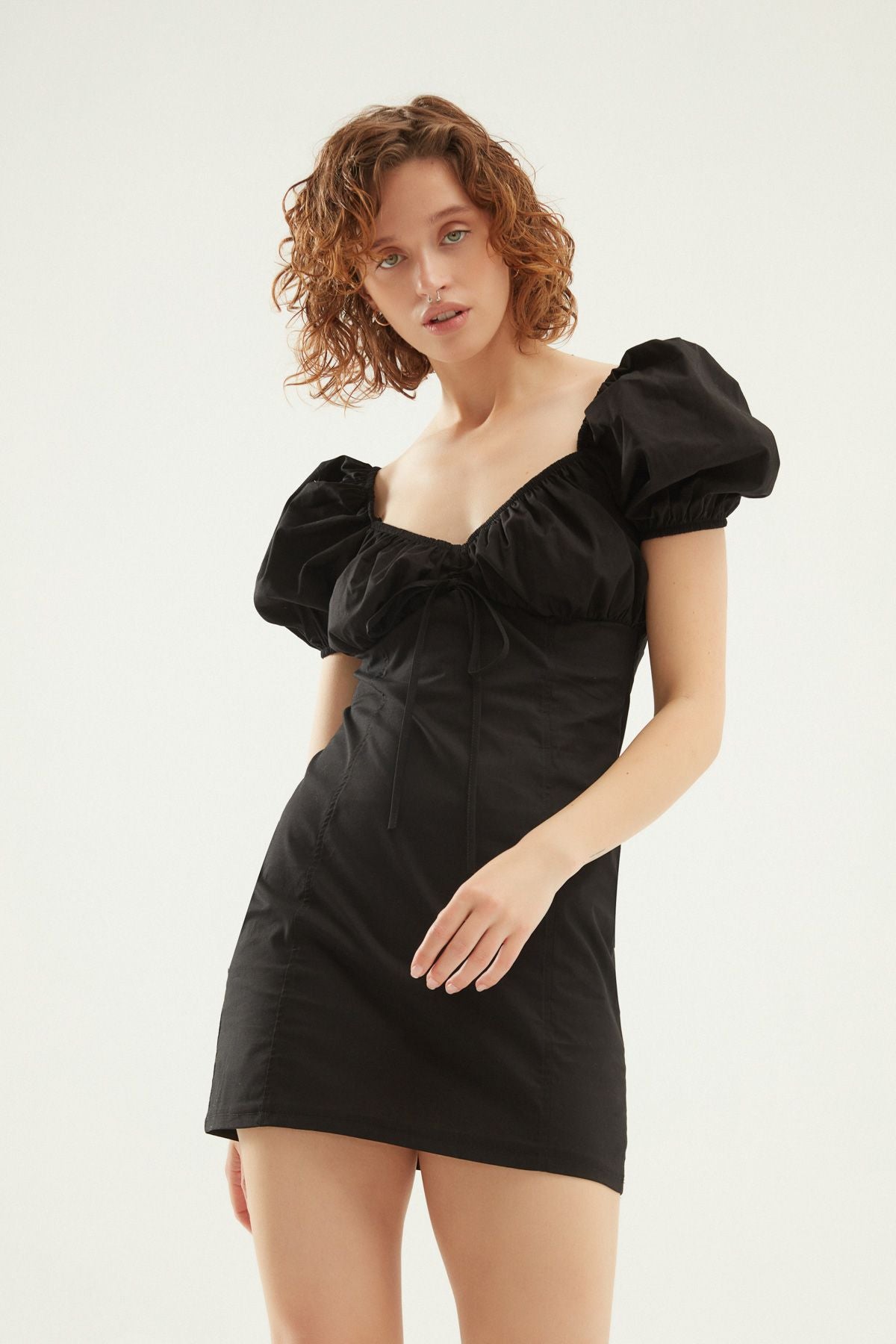V Yaka Balon Kol Mini Elbise Siyah