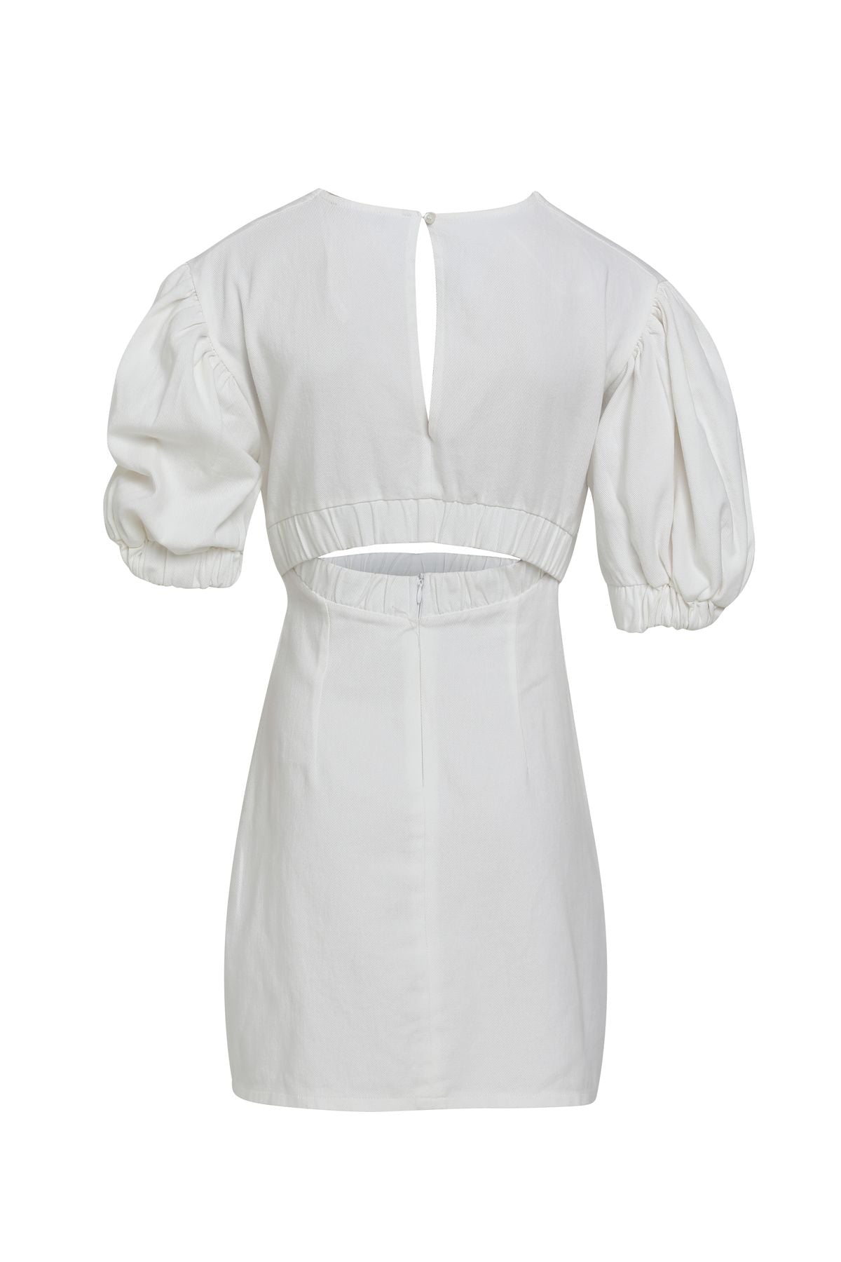 V Yaka Cut Out Gabardin Elbise Beyaz