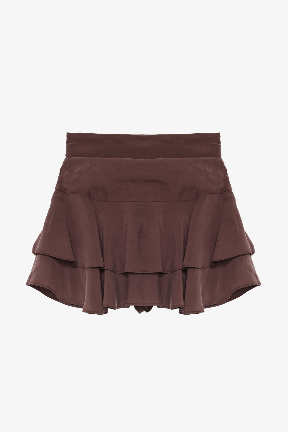 Çift Kemerli Pileli Kadife Mini Etek Kahverengi