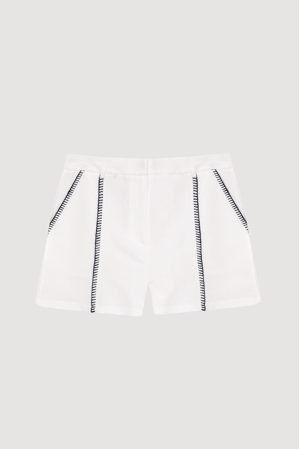 Dikiş Çizgili Keten Mini Şort Beyaz