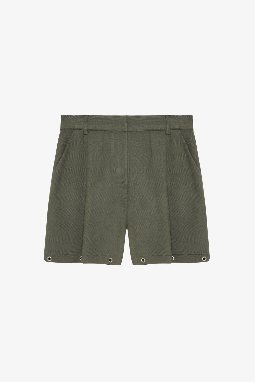 Kuş Gözü Aksesuarlı Önü Pileli Mini Şort Haki