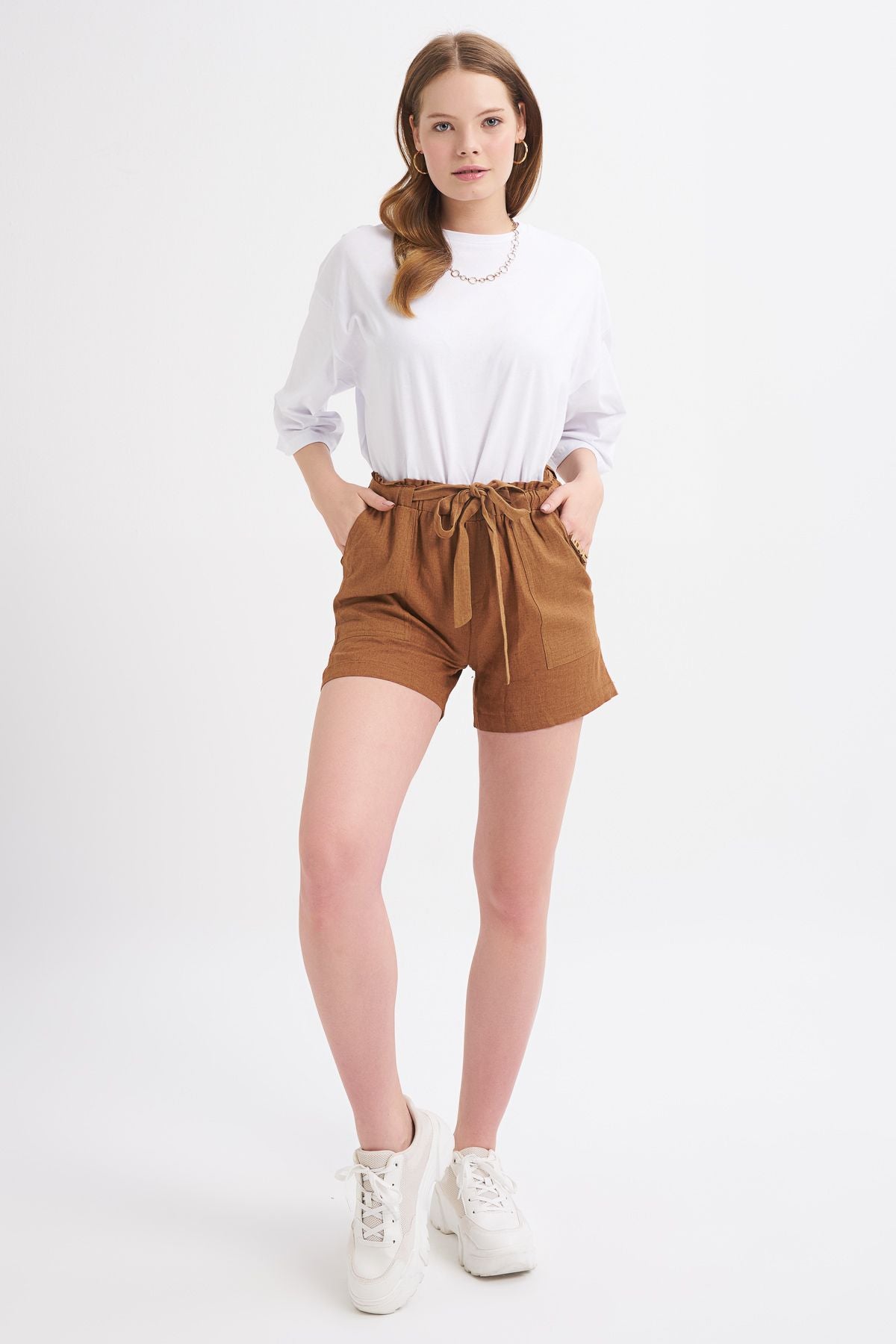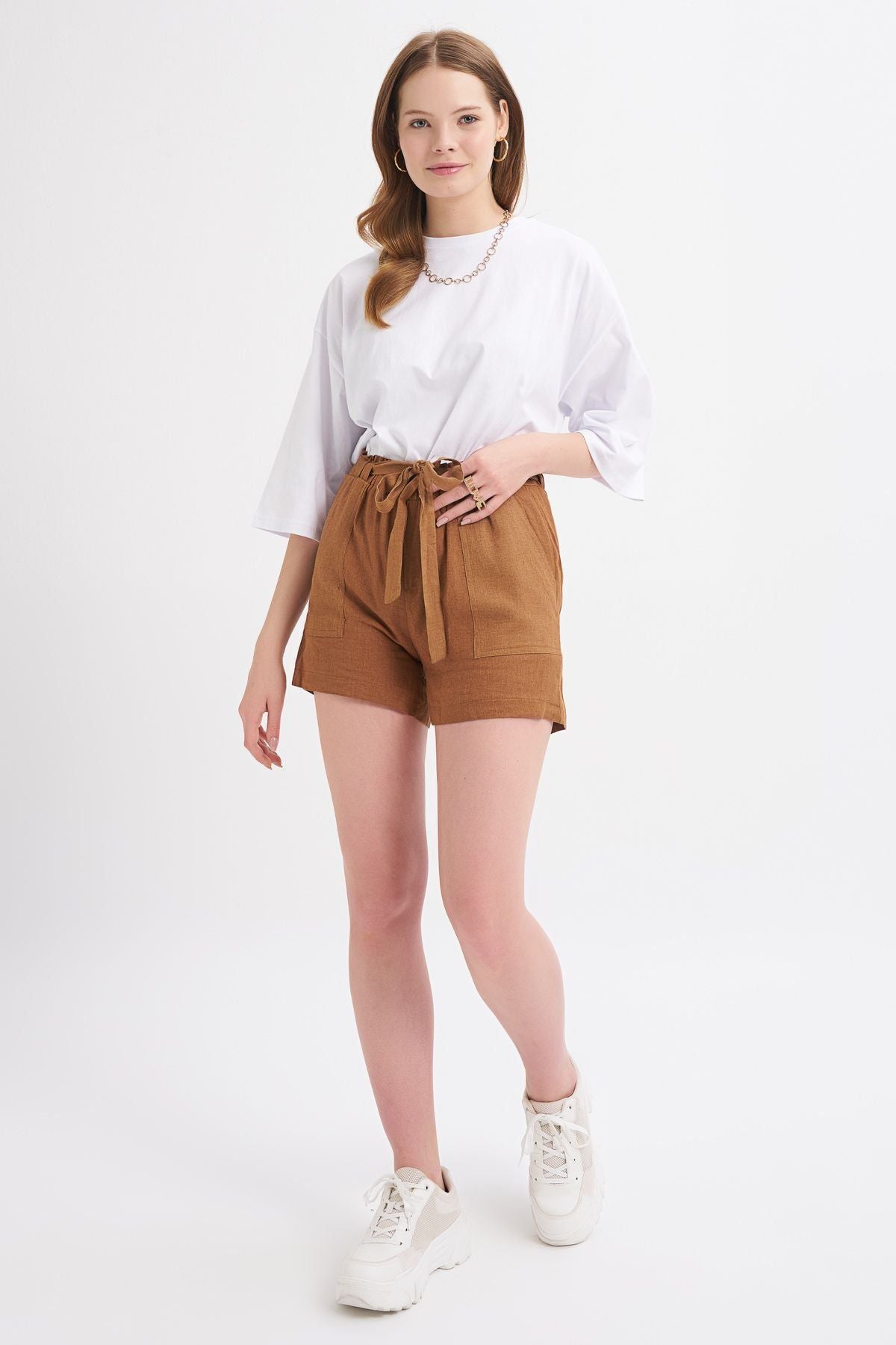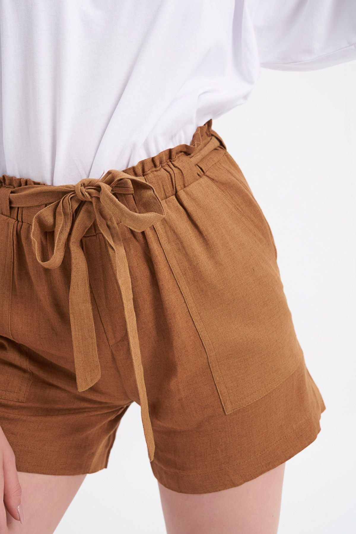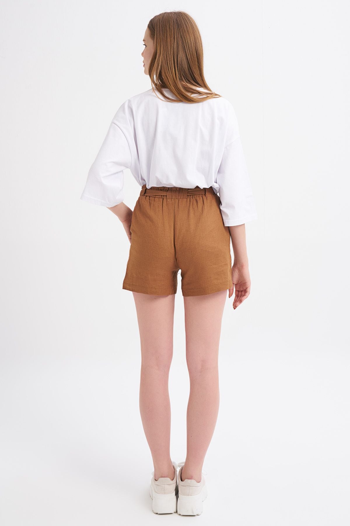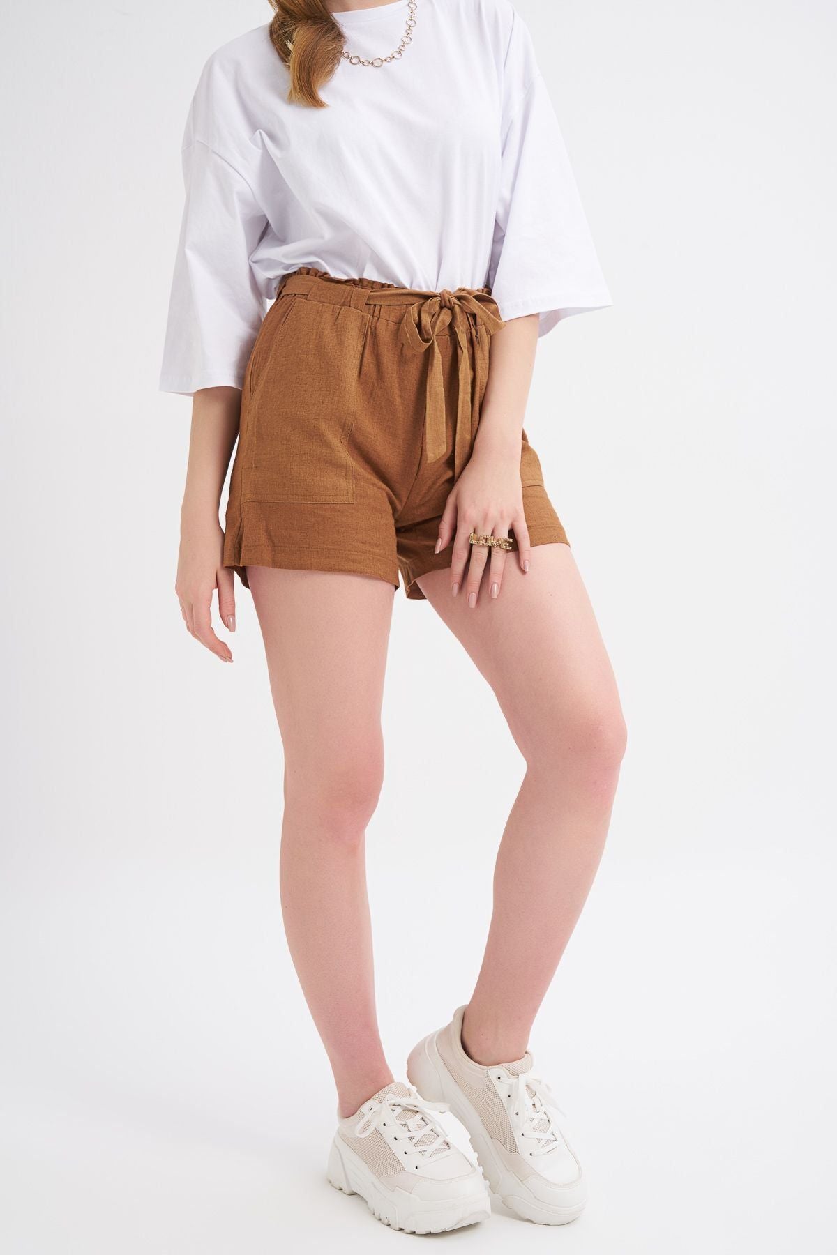 Kuşaklı Yüksek Bel Keten Şort Kahverengi