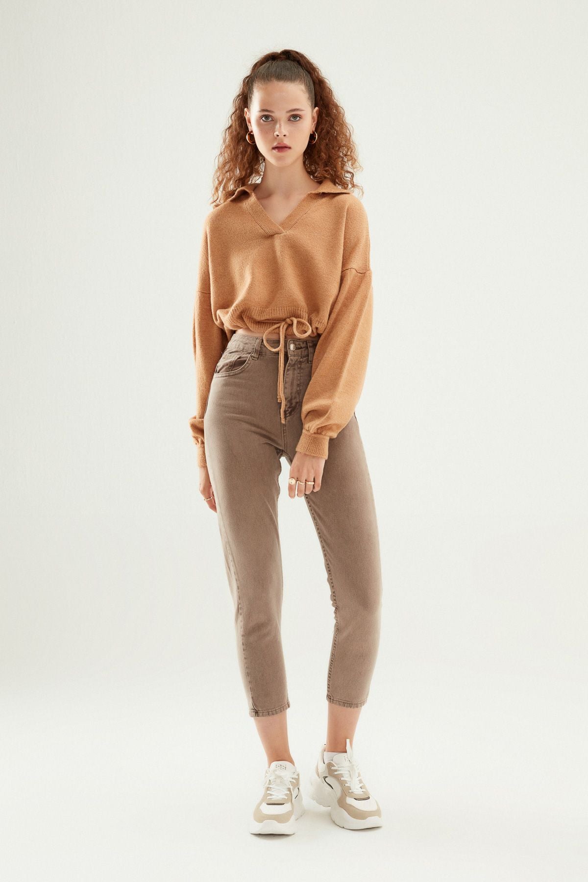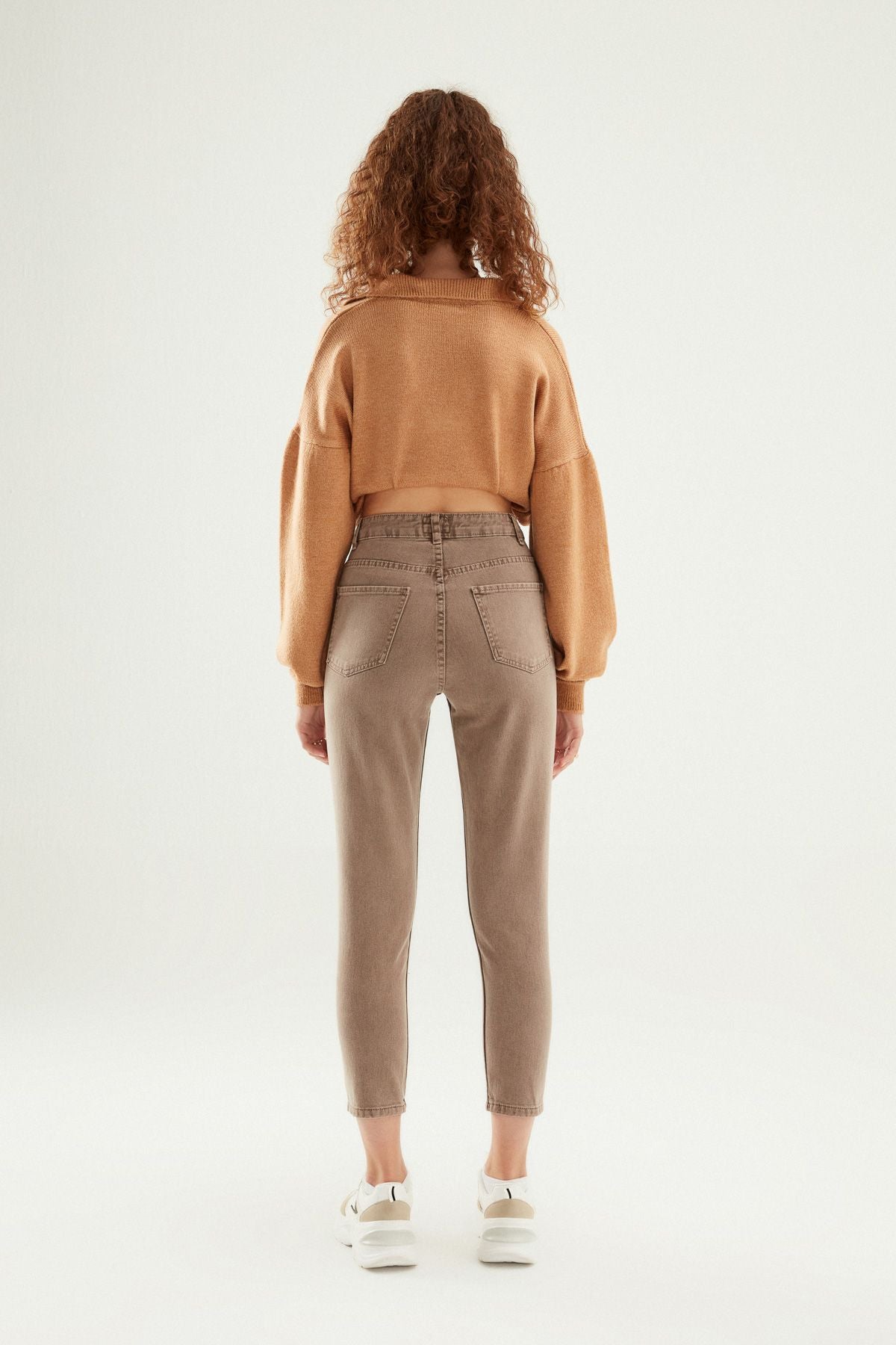 Pamuk denim dokulu mom pantolonun eskitme detayı ile tarzında fark yarat! Yüksel bel, ön ve arka kısmı ceplidir.
