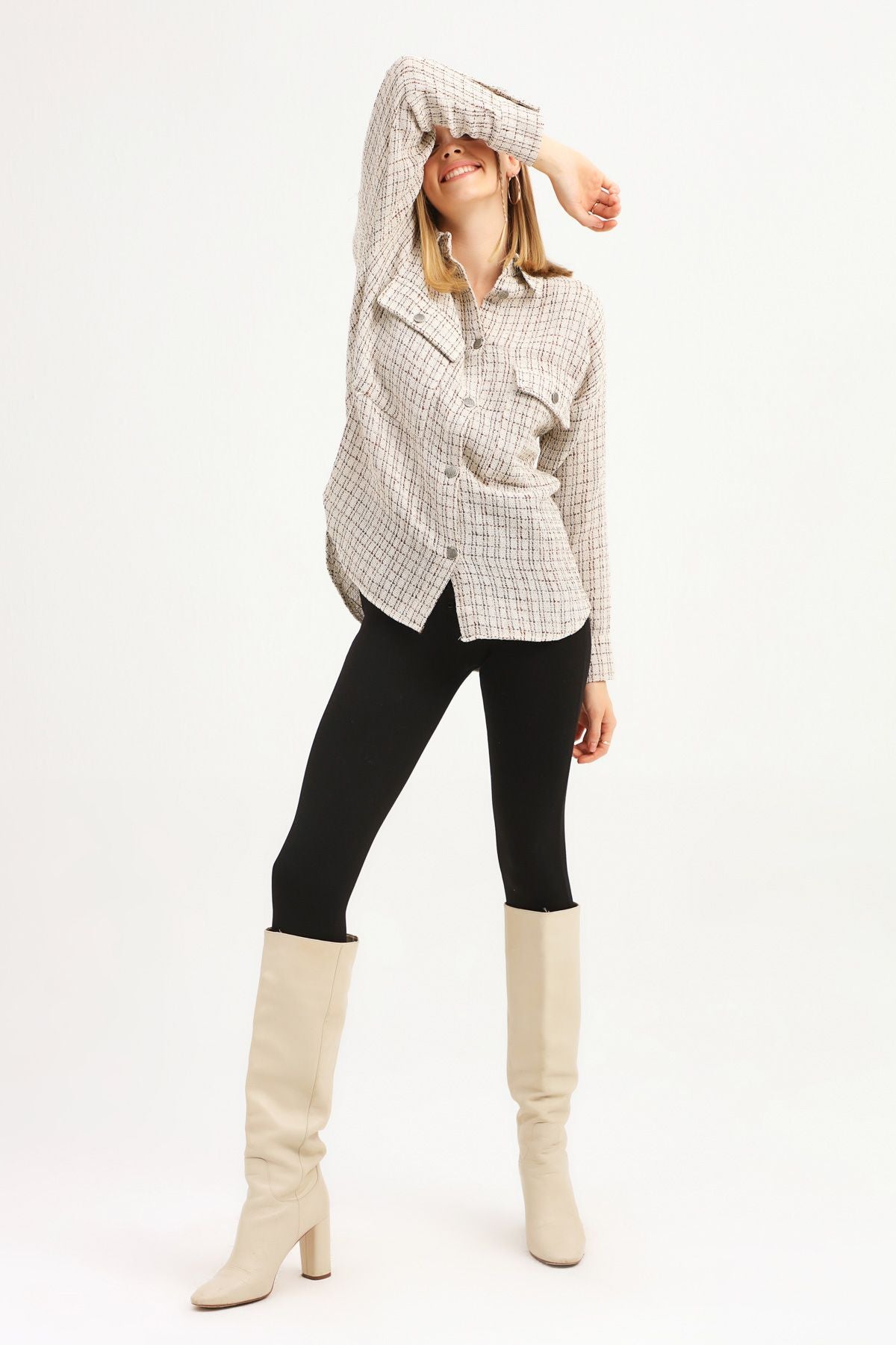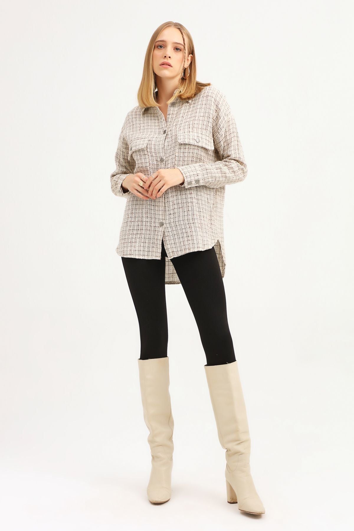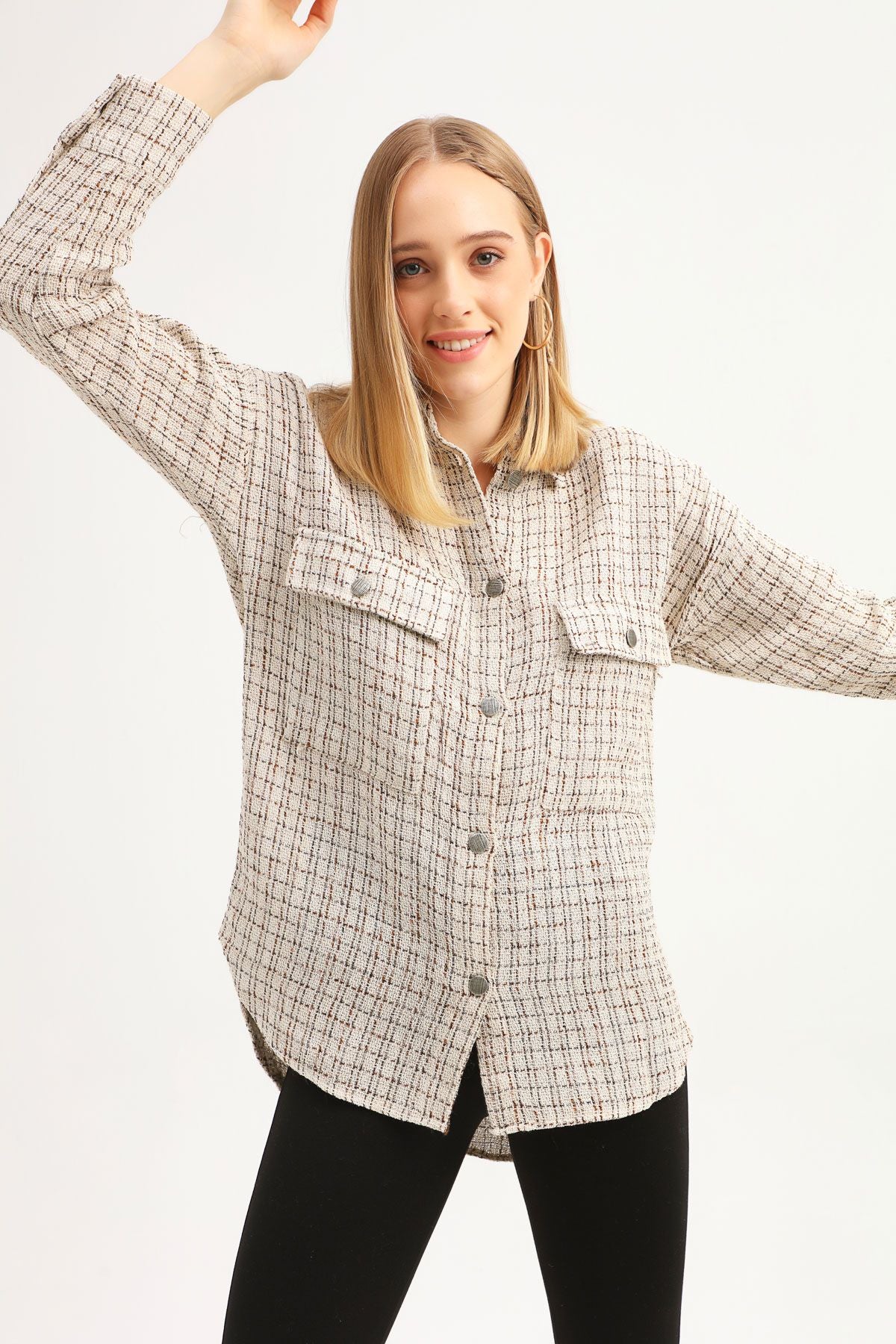 Bazı detaylar tarzı daha özel kılar. Tüvit cepli gömlekte kullanılan inci düğmeler gömleğin ışıltısını bir kat daha artırırken, tasarımı daha özel bir hale getiriyor. Günlük stilinin özenli parçalarından birisi olacak gömleğini, fit pantolonlarla kombinleyebilirsin.