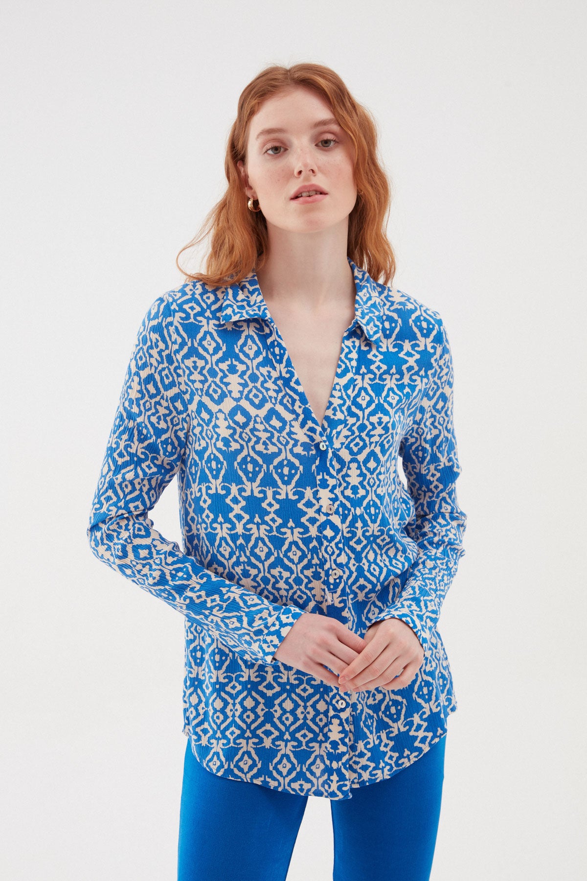 Desenli V Yaka Gömlek Mavi