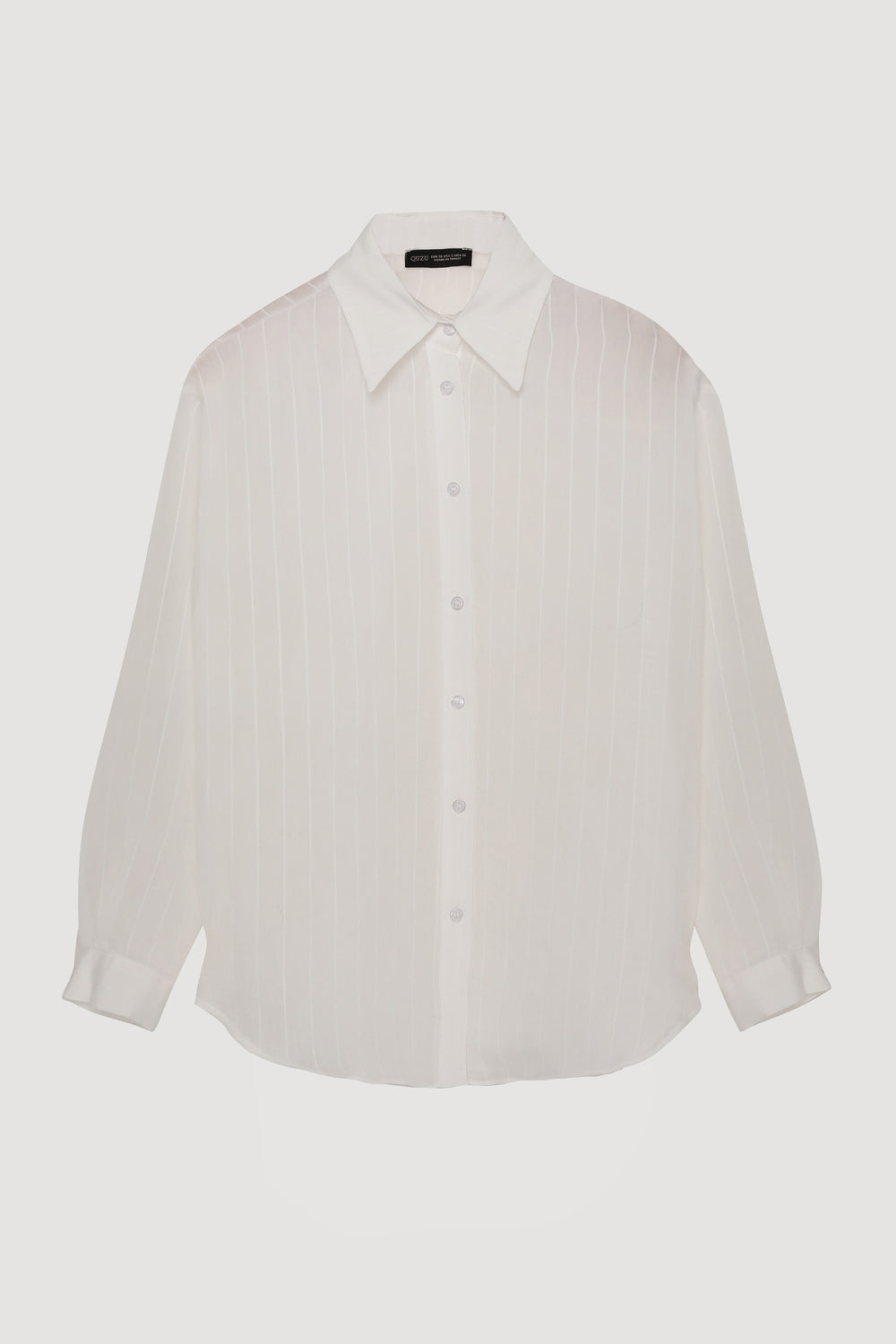 Dikey ince çizgili desenli, gömlek yaka, uzun kollu, önü düğme kapamalı, modern ve şık oversize kesim gömlek.