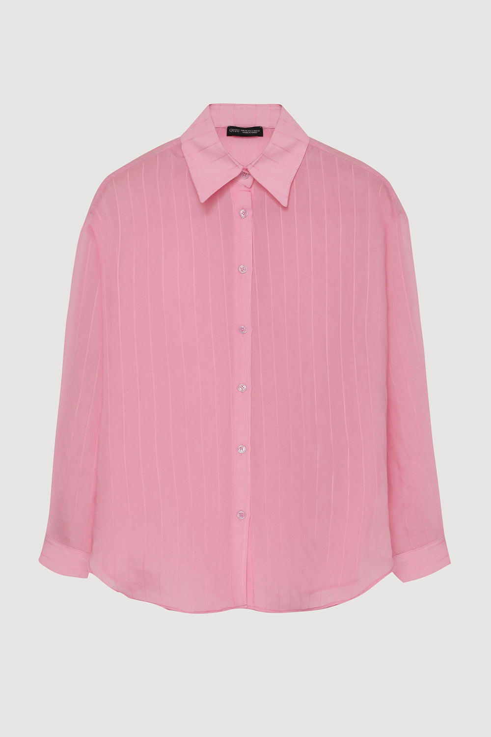 Dikey ince çizgili desenli, gömlek yaka, uzun kollu, önü düğme kapamalı, modern ve şık oversize kesim gömlek.