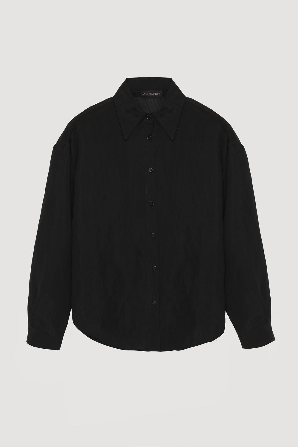 Dikey ince çizgili desenli, gömlek yaka, uzun kollu, önü düğme kapamalı, modern ve şık oversize kesim gömlek.