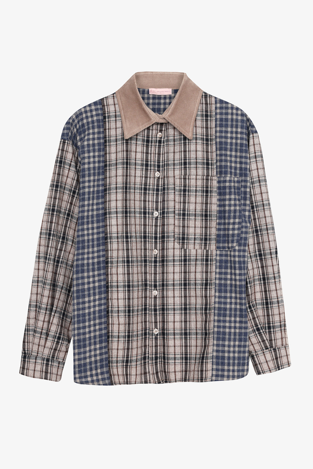 Kontrast renk bloklu ekose desenli, kadife yaka detaylı, uzun kollu,yumuşak kumaş, oversize gömlek.