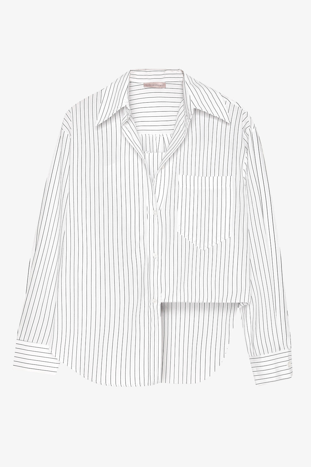 Çizgili desene sahip, önü asimetrik askı detaylı, uzun kollu, düğme kapamalı, oversize kesim gömlek.