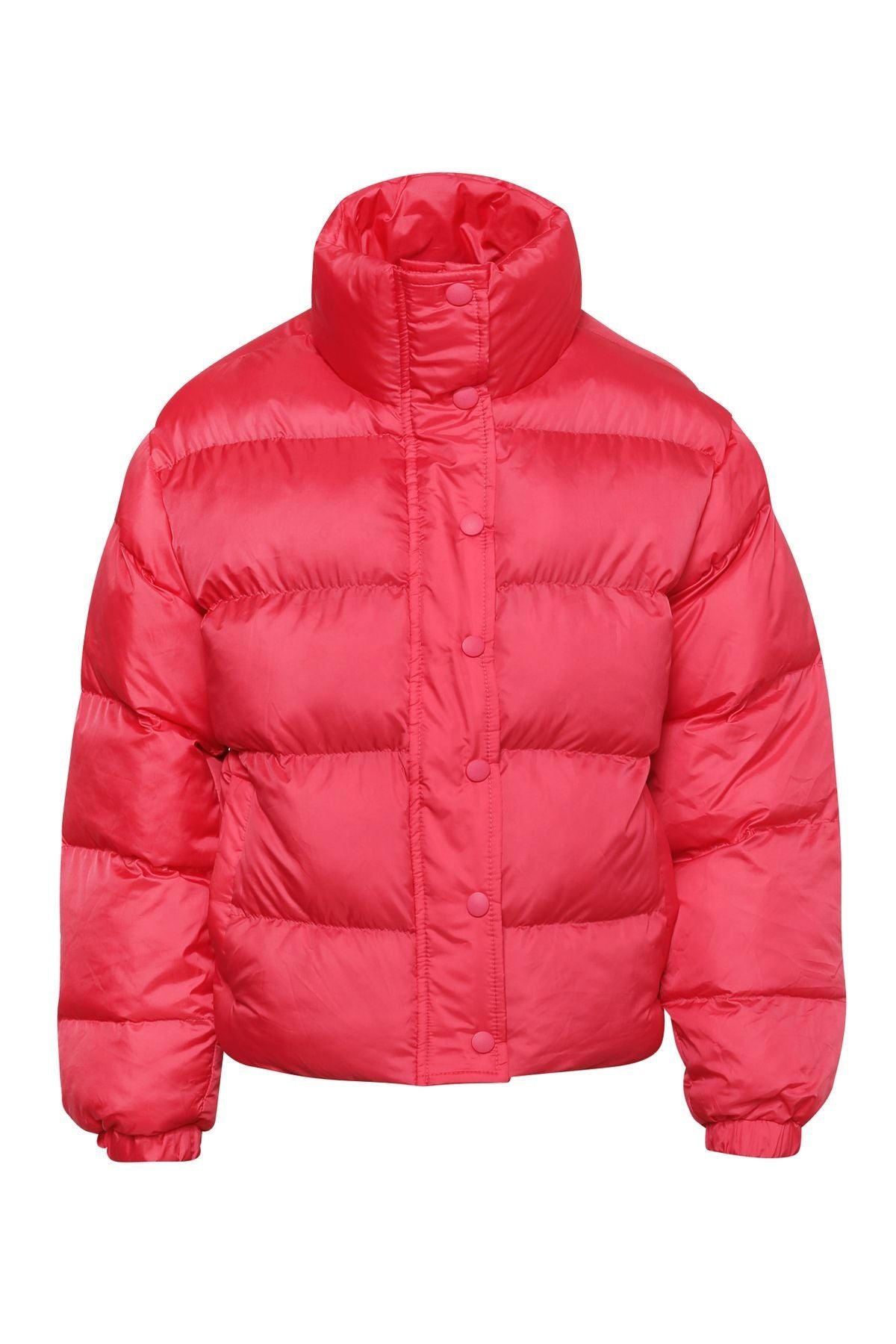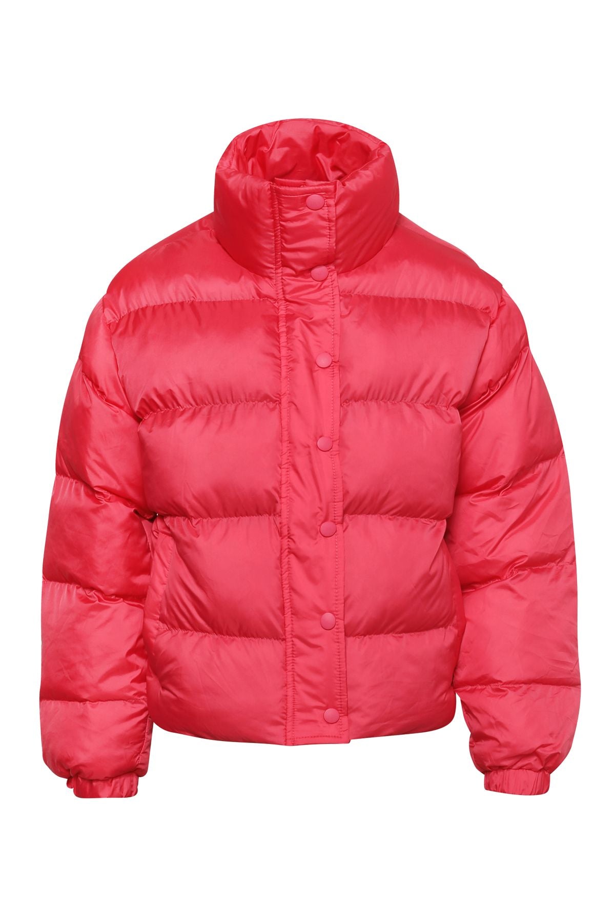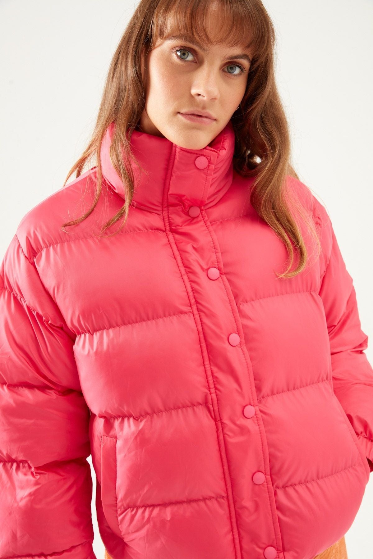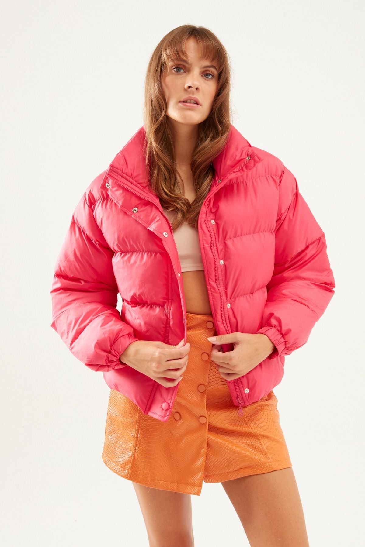 İki cepli, fermuarlı ve çıtçıt düğmeli, uzun kollu, kol ucu lastikli, puf dolgulu, dik yaka, kısa şişme mont