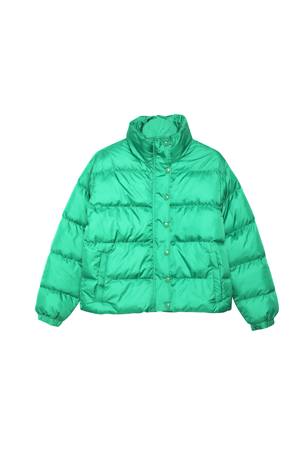 İkİ ceplİ, fermuarlı ve çıtçıt düğmelİ, uzun kollu, kol ucu lastİklİ, puf dolgulu, dİk yaka, kısa şİşme mont