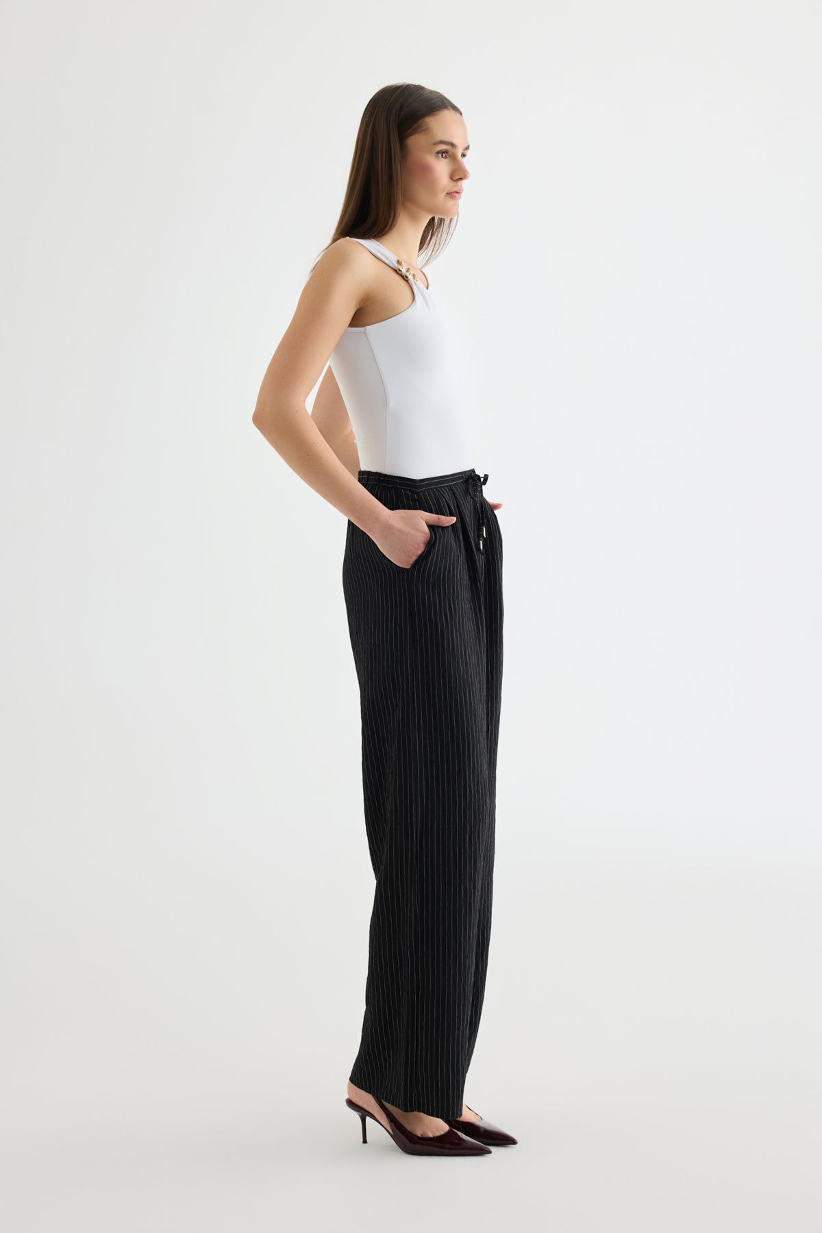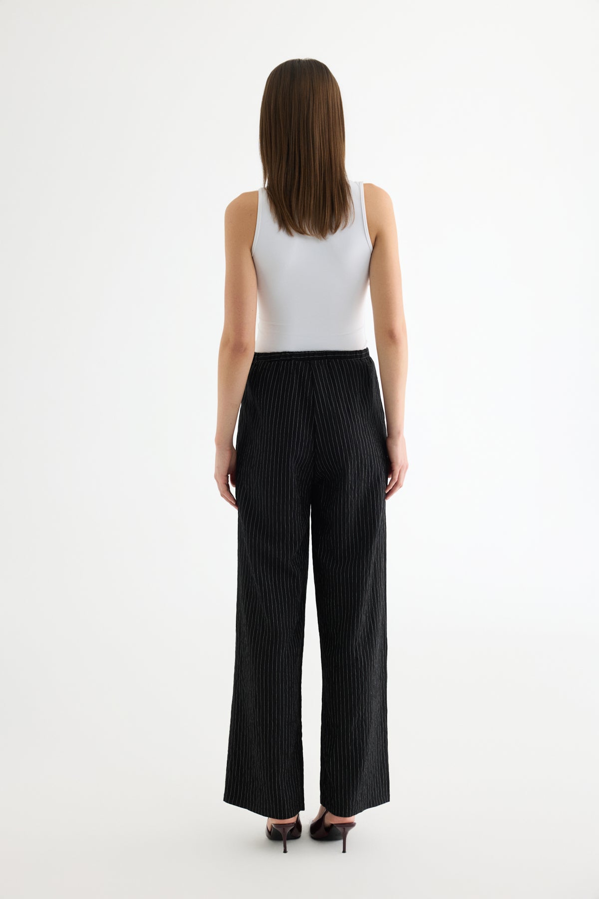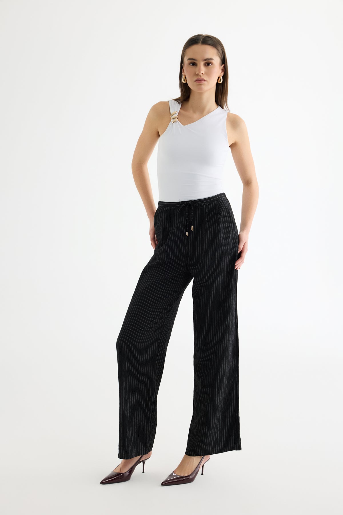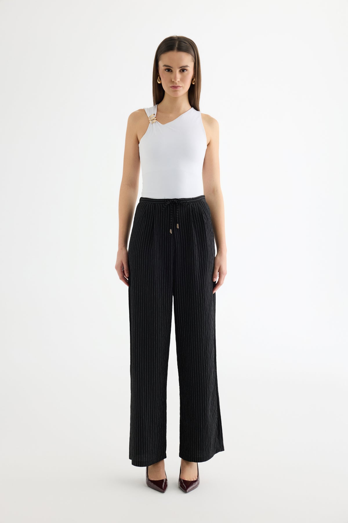 Çizgili Bağcıklı Bol Paça Pantolon Siyah