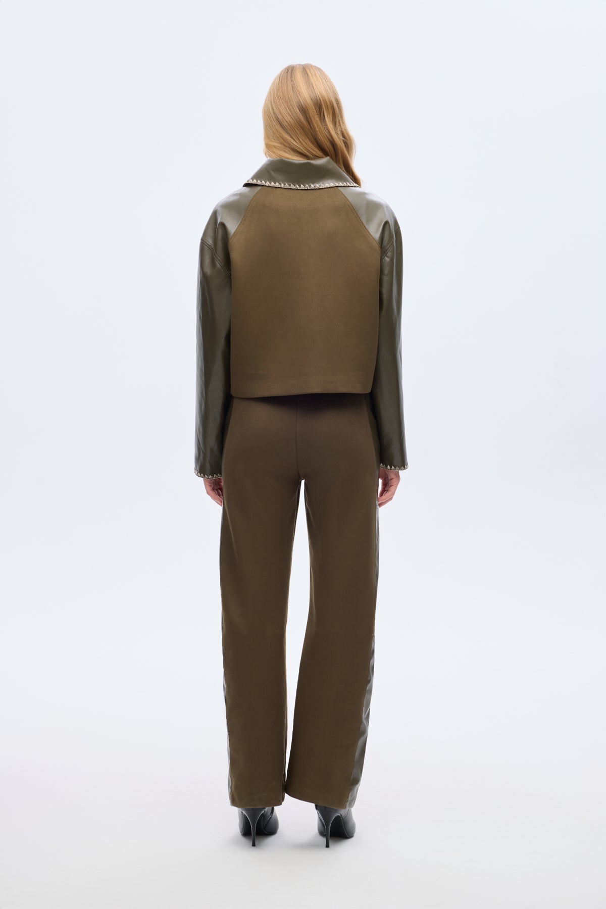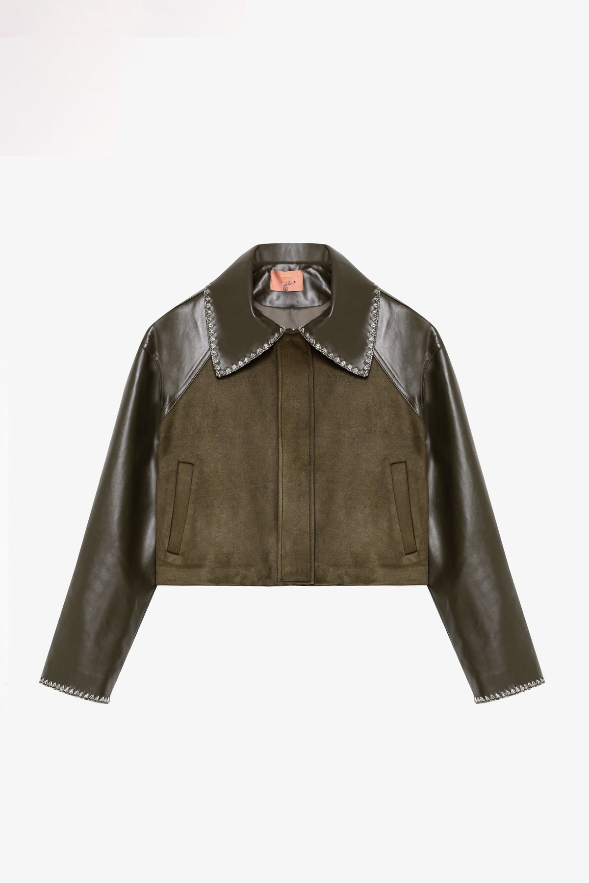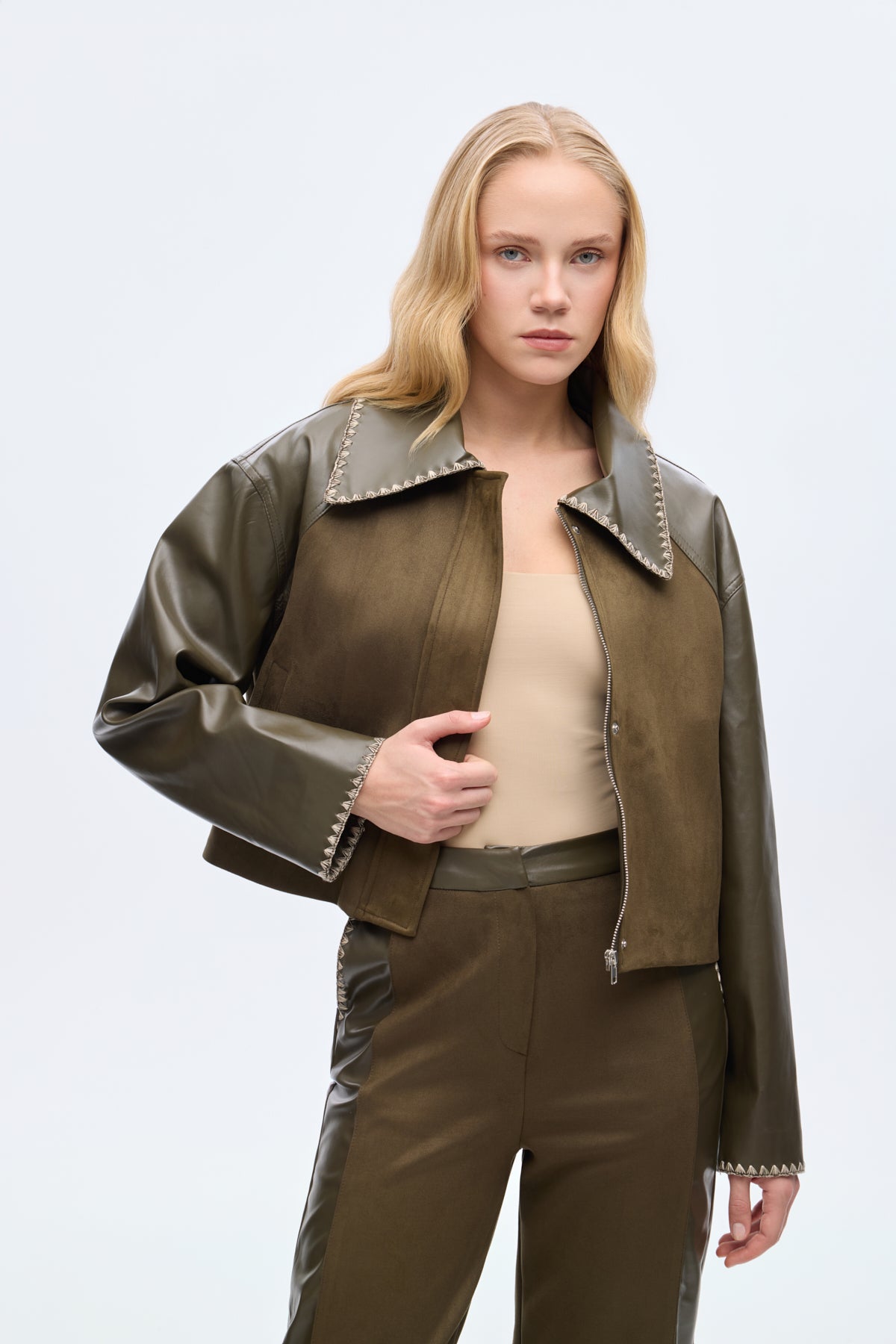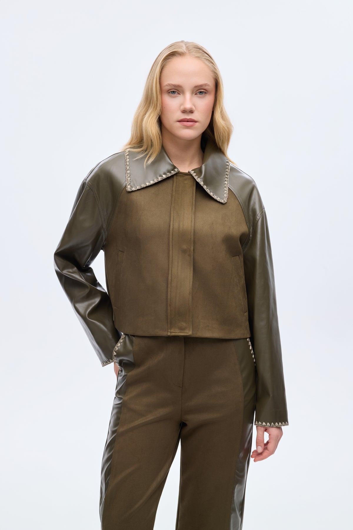 İçi astarlı, yakası ve kolları deri garnili, geniş yakalı, cepli, yakasında ve kol uçlarında dikiş detaylı, uzun kollu, fermuar ve çıtçıt kapamalı, kısa süet ceket.