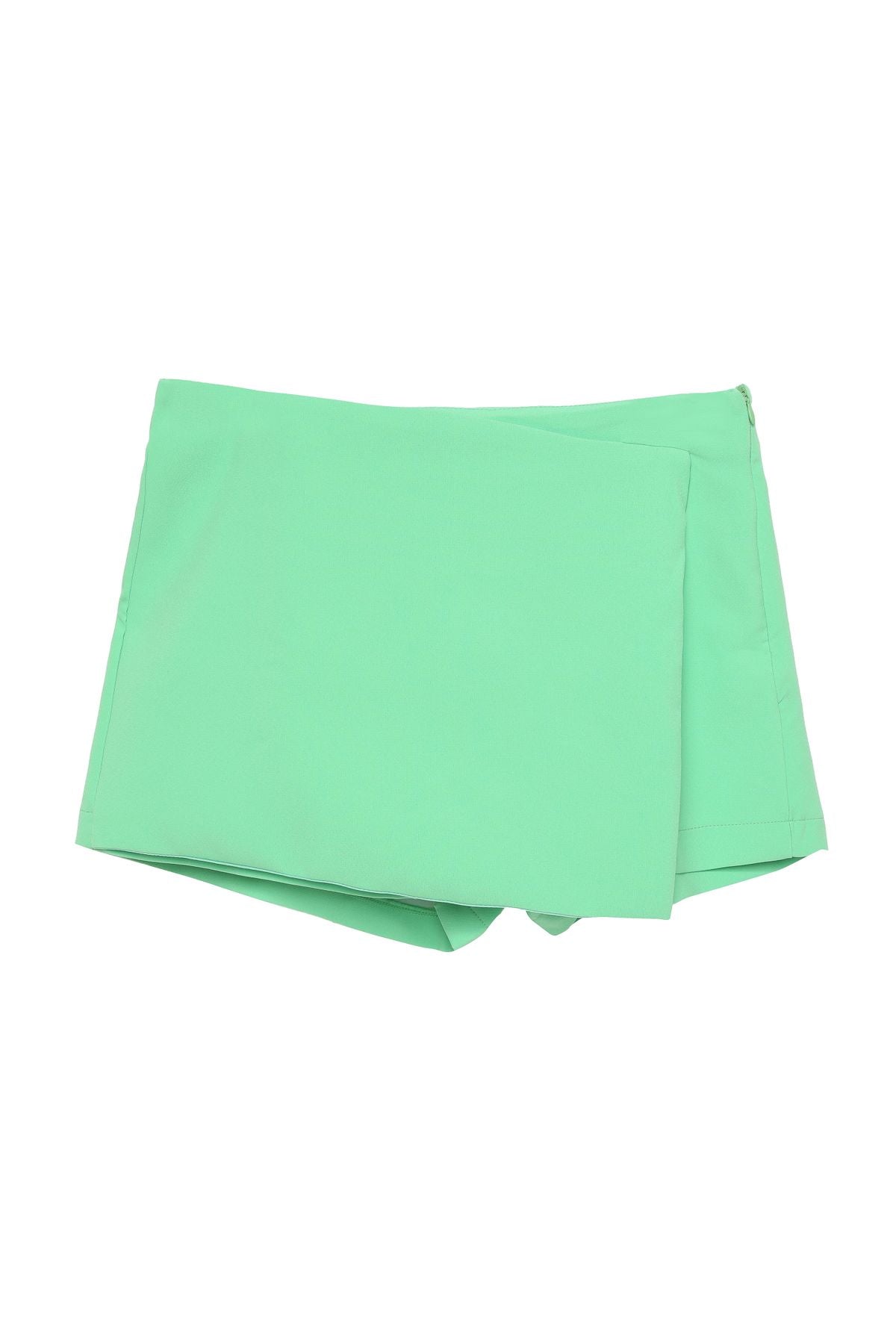 Arkası gizli cepli, yüksek bel, asimetrik kesim, mini şort etek.