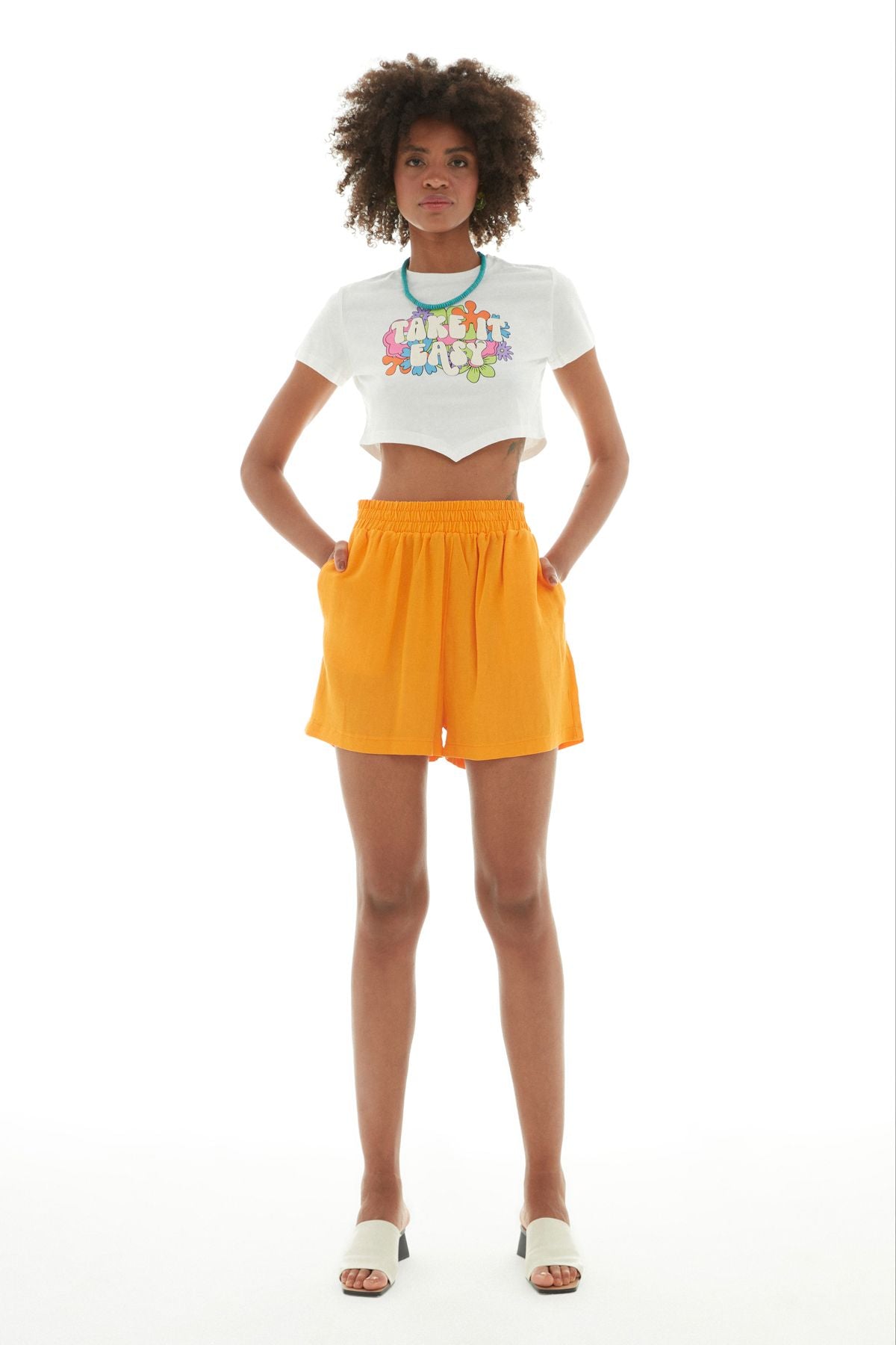 Cepli şort modeli, koleksiyonumuzdan seçeceğin üst parçalarla cool ve neşeli kombinlere dönüşüyor. Beli lastikli şort modeli keten, pamuk ve viskon içeriği sayesinde yaz mevsiminin sıcaklığında konforlu ve belinin lastikli tasarımı ile rahat giyim sağlıyor.