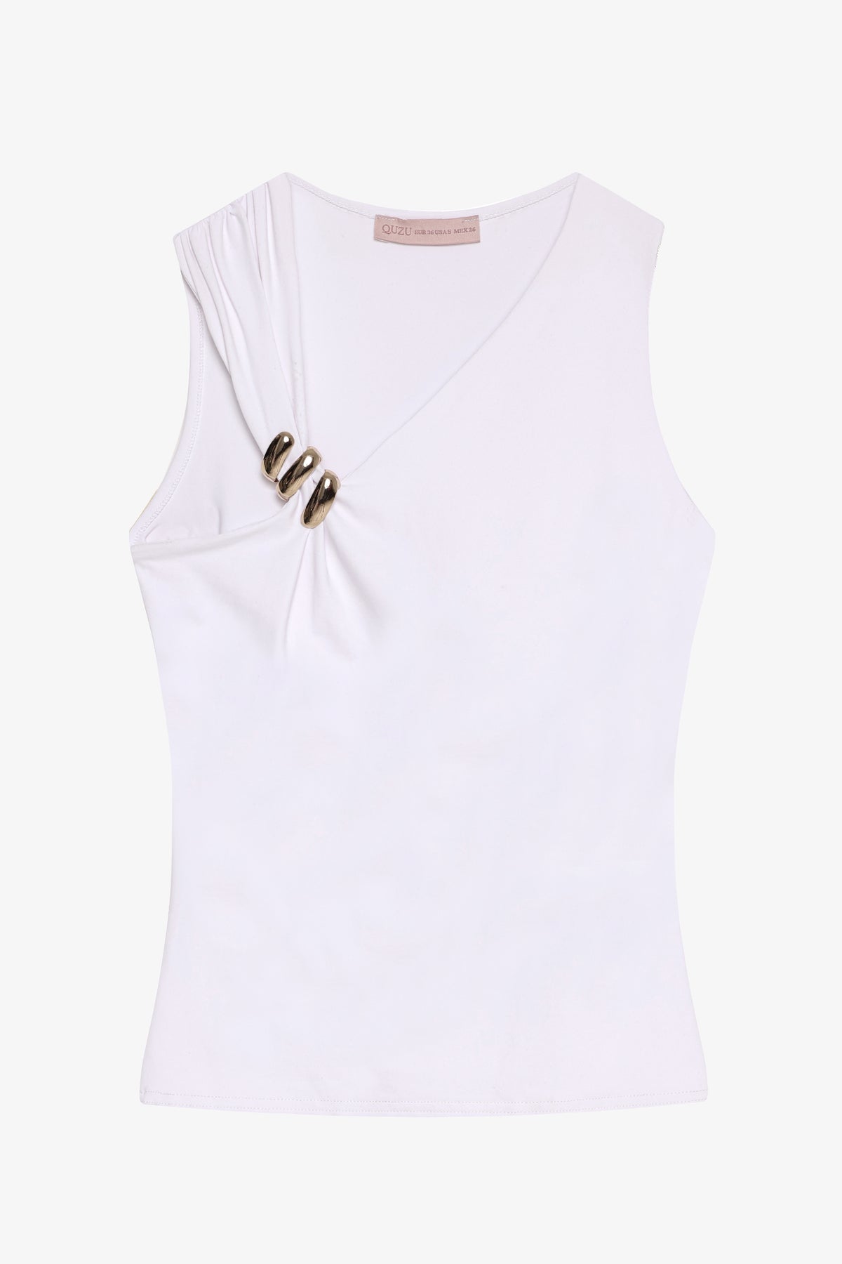 Asimetrik Yaka Metal Aksesuarlı Bluz Ekru