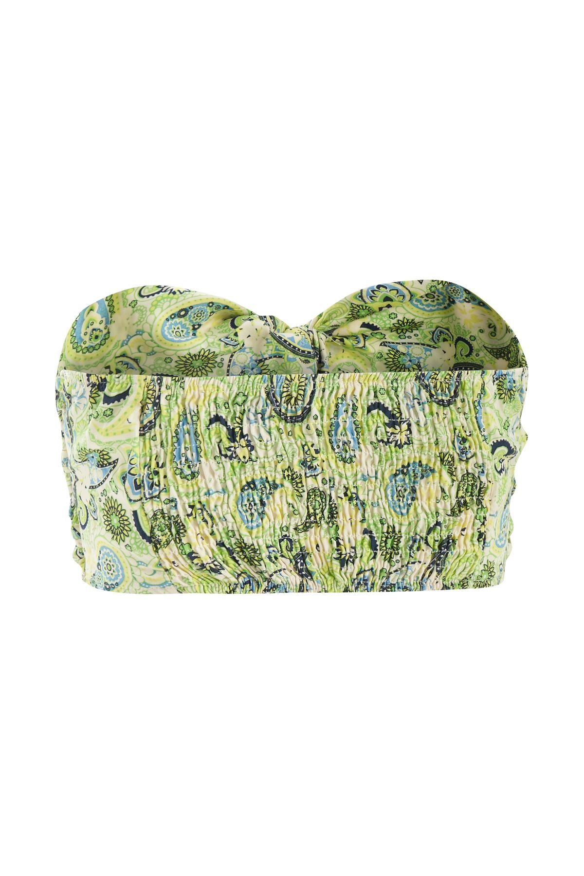 Desenli, önü düğüm detaylı, gizli fermuarlı, arkası gipeli, önü cut-out detaylı, çok renkli, straplez bluz.