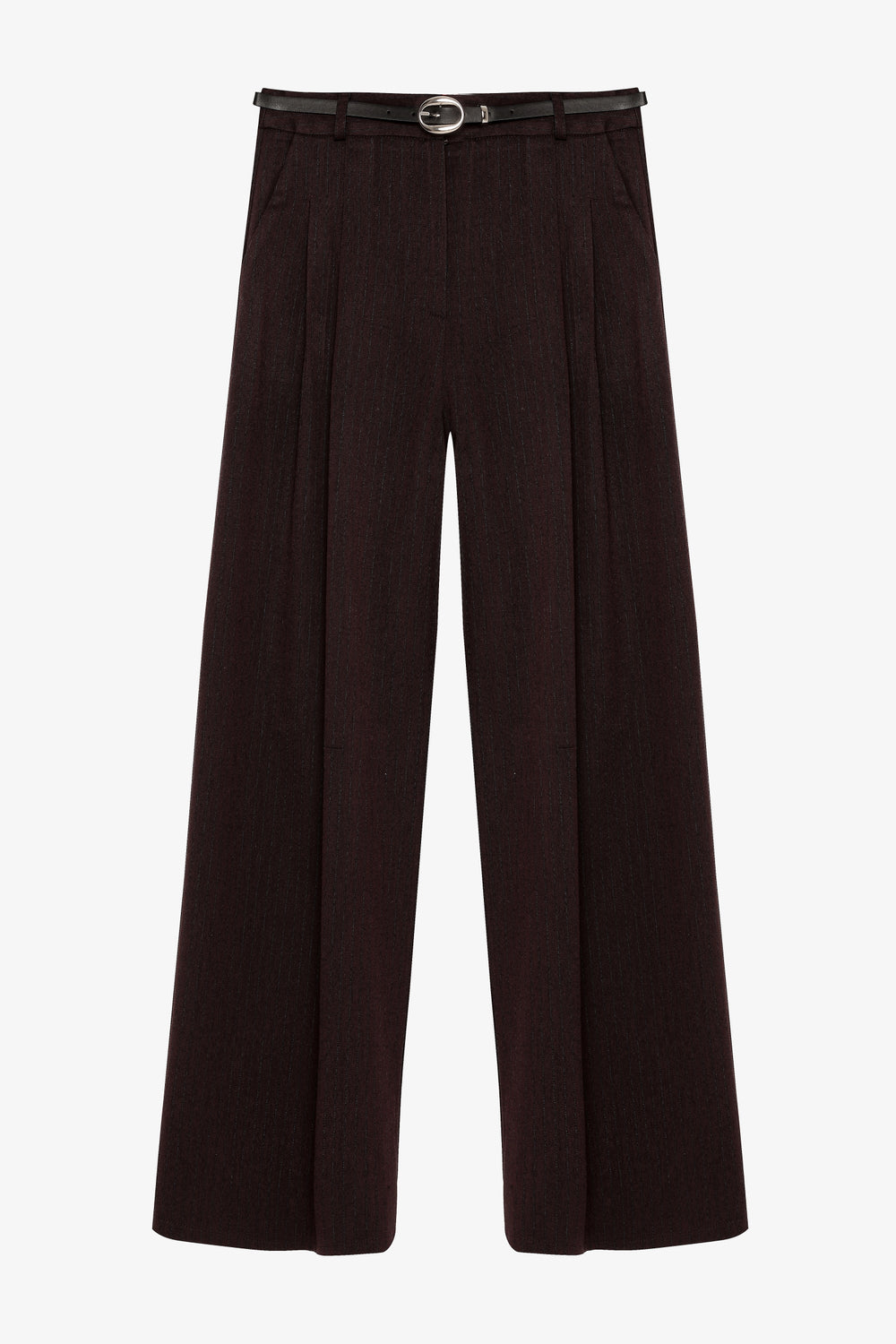 Kemerli Yüksek Bel Pileli Palazzo Pantolon Kahverengi