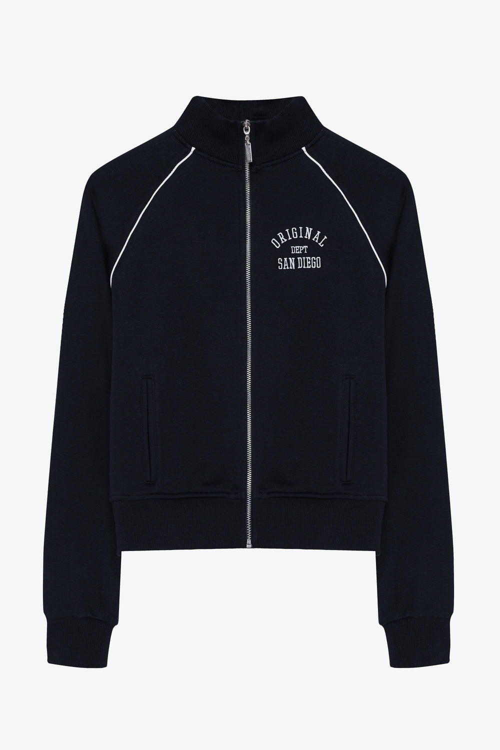 Önü fermuarlı, dik yaka, göğüs kısmında yazı nakış detaylı, cepli, sırtı yazı baskılı, şardonsuz, uzun kollu, biye detaylı, slim fit sweatshirt.