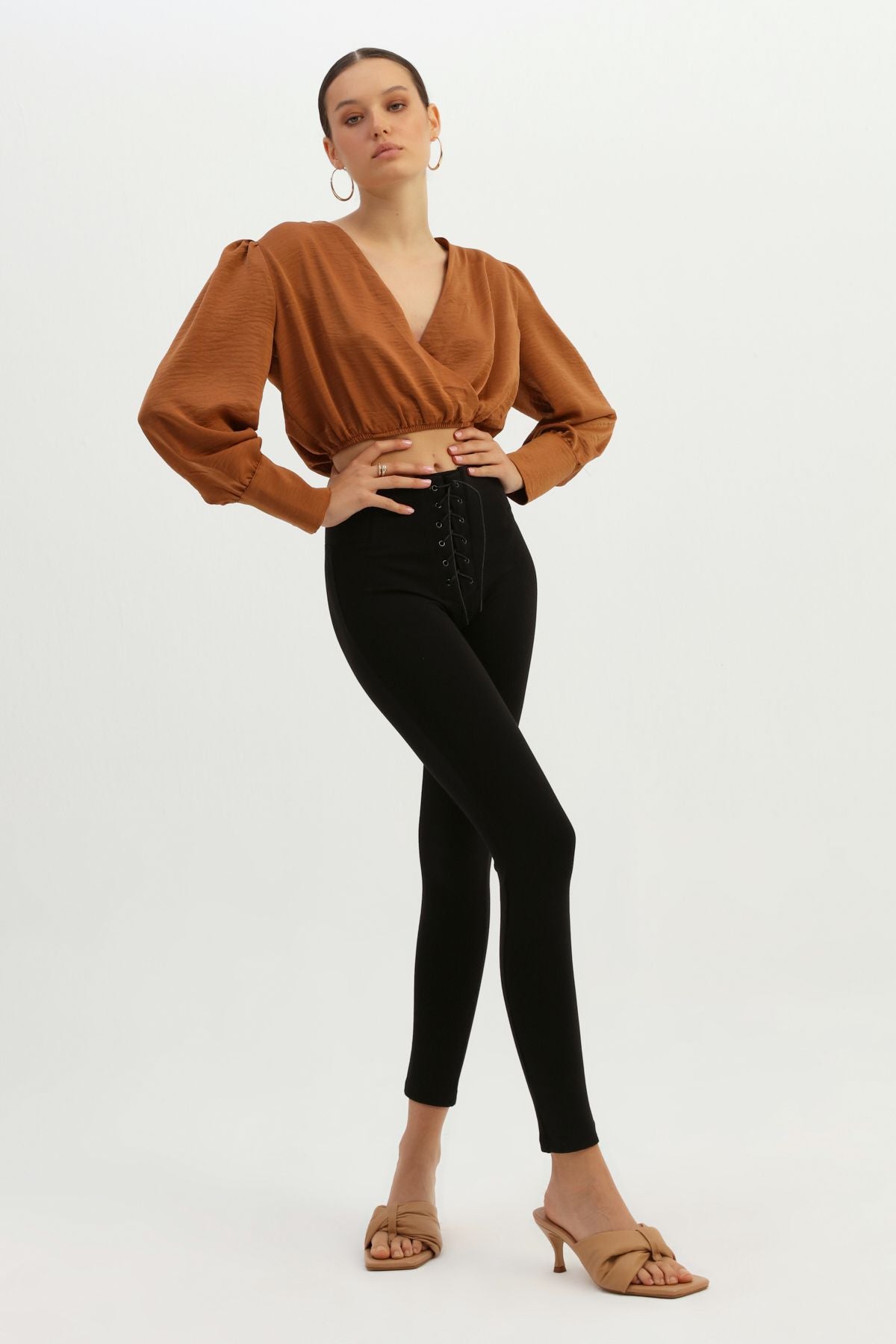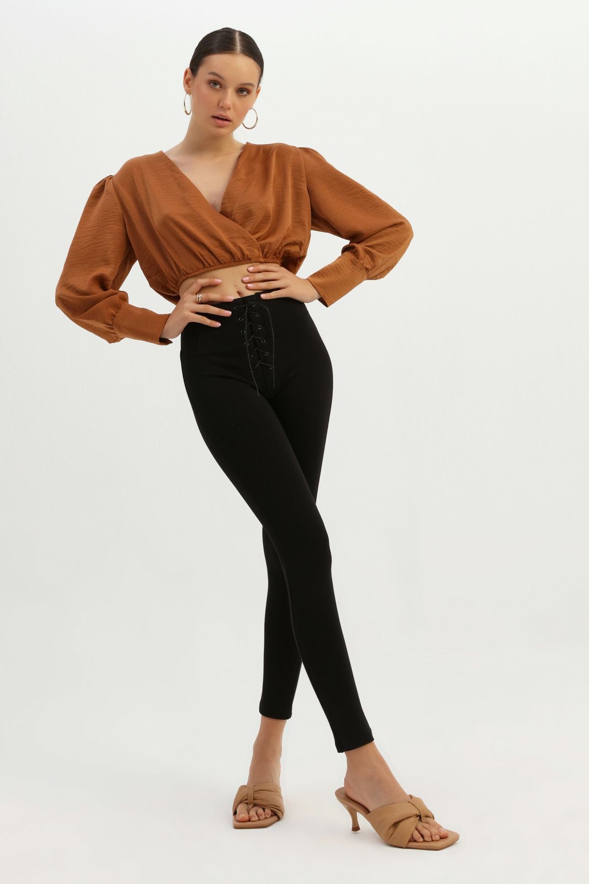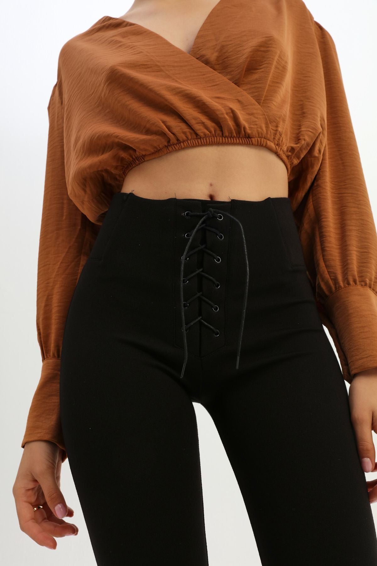 Bağcık Detaylı Yüksek Bel Tayt Siyah