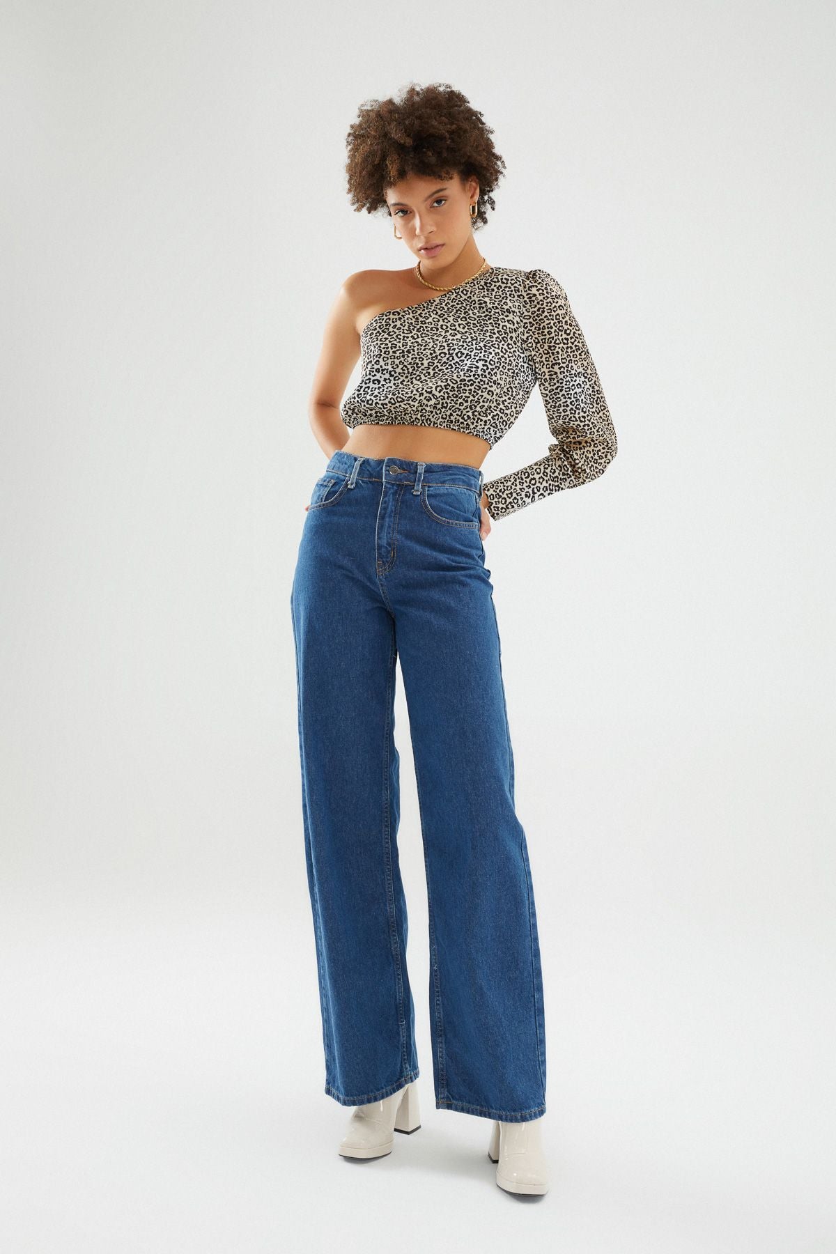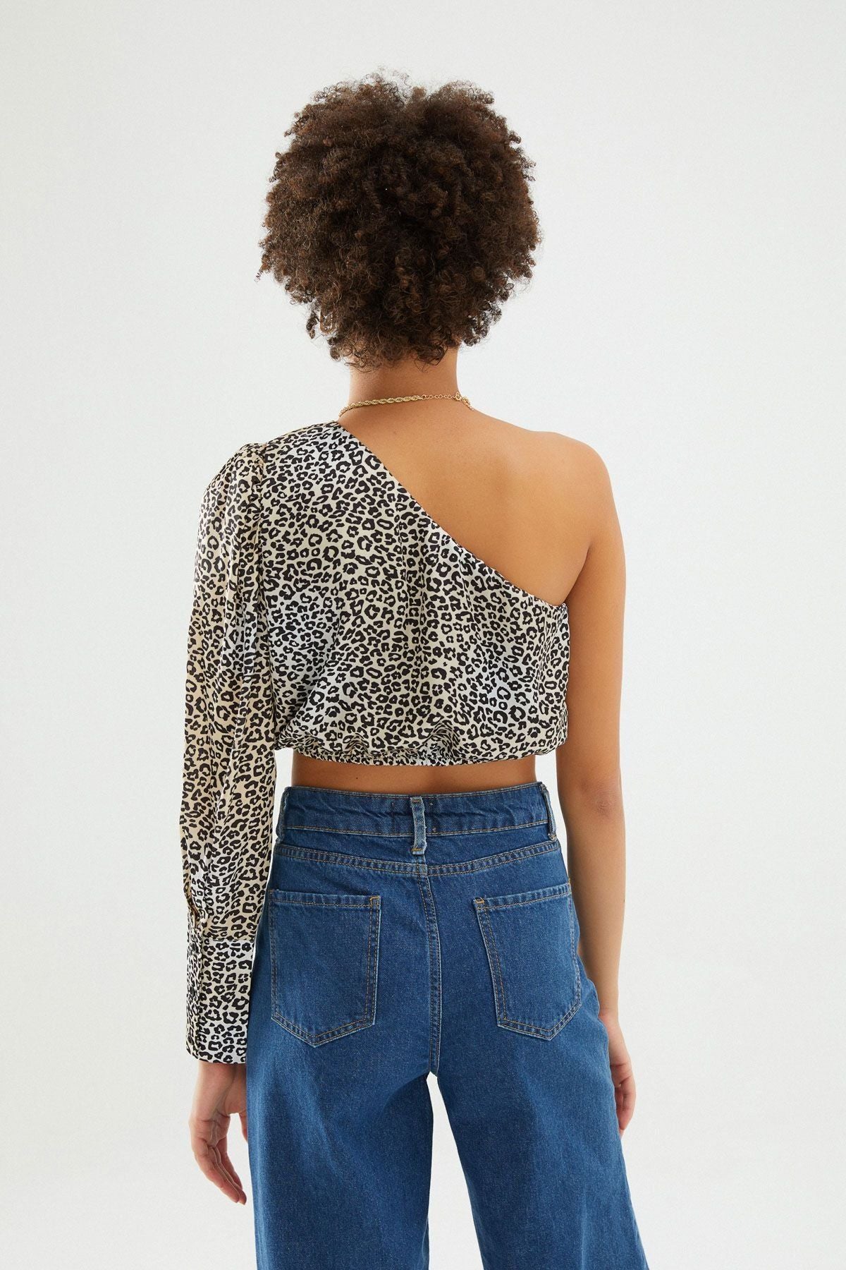 Leopar Tek Omuz Saten Bluz Kahverengi