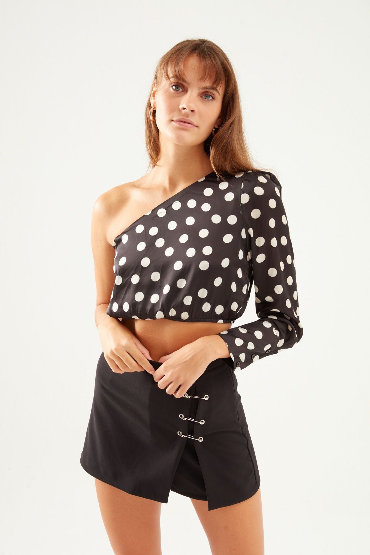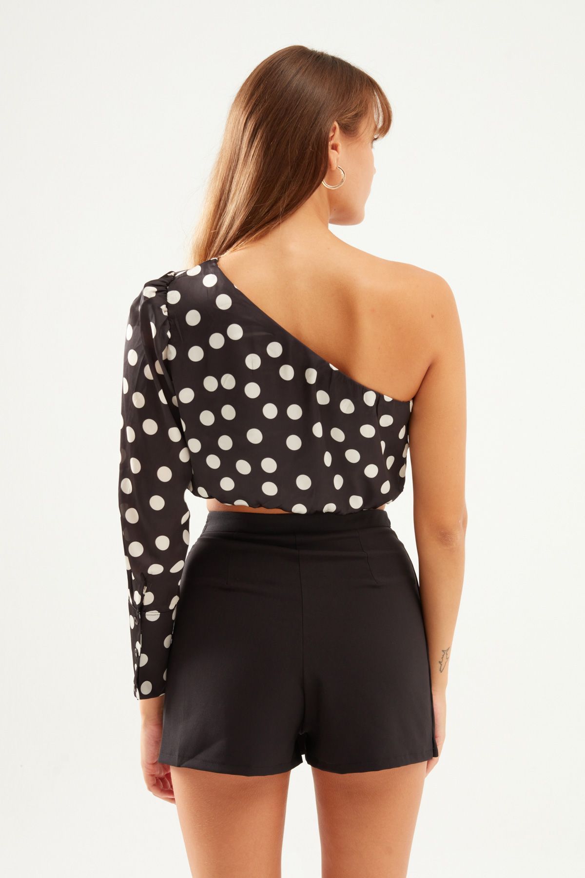 Puantiyeli Tek Omuz Saten Bluz Siyah