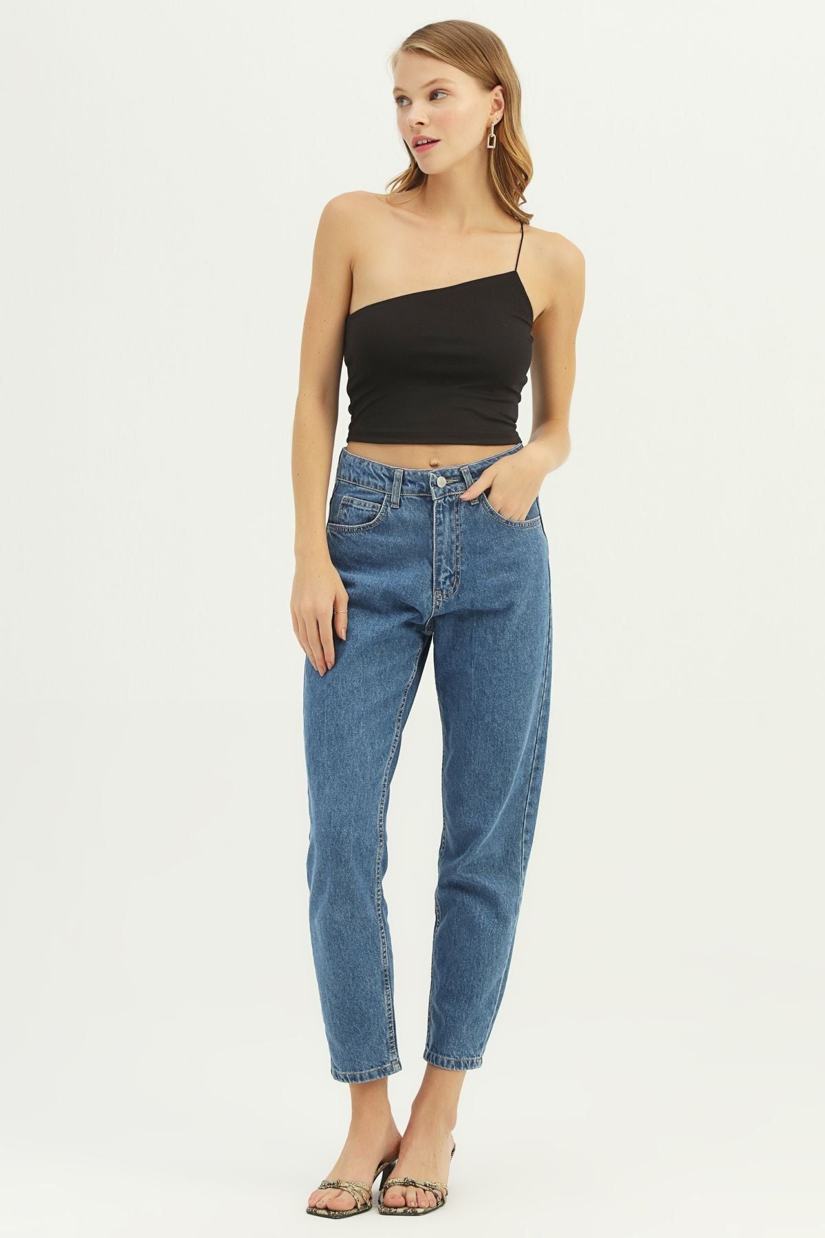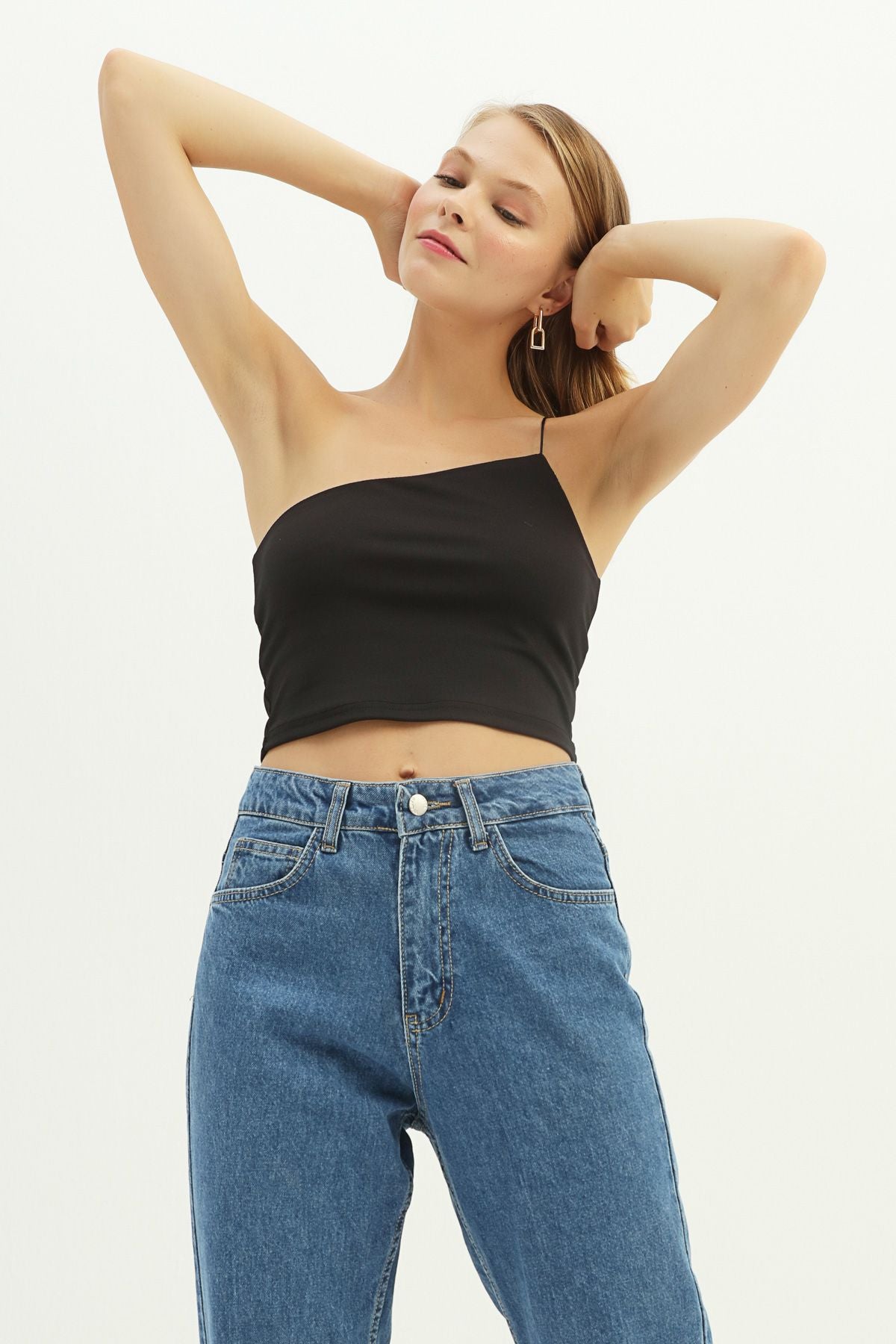 Tek Omuz Askılı Crop Bluz Siyah