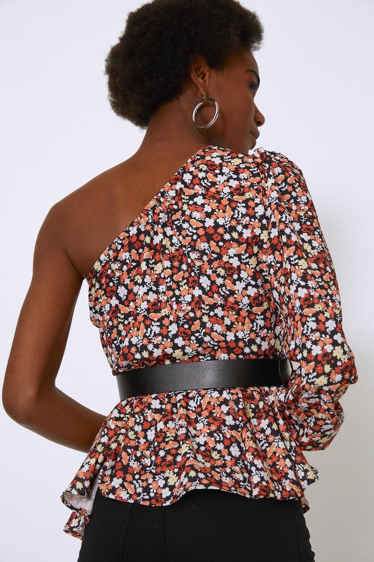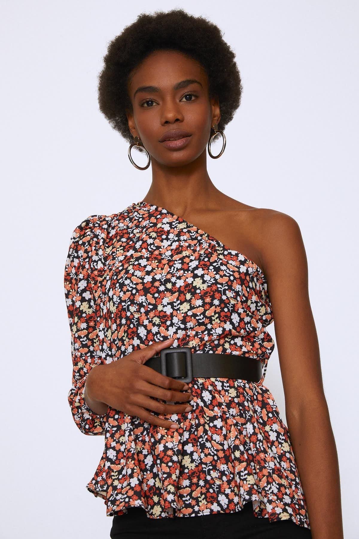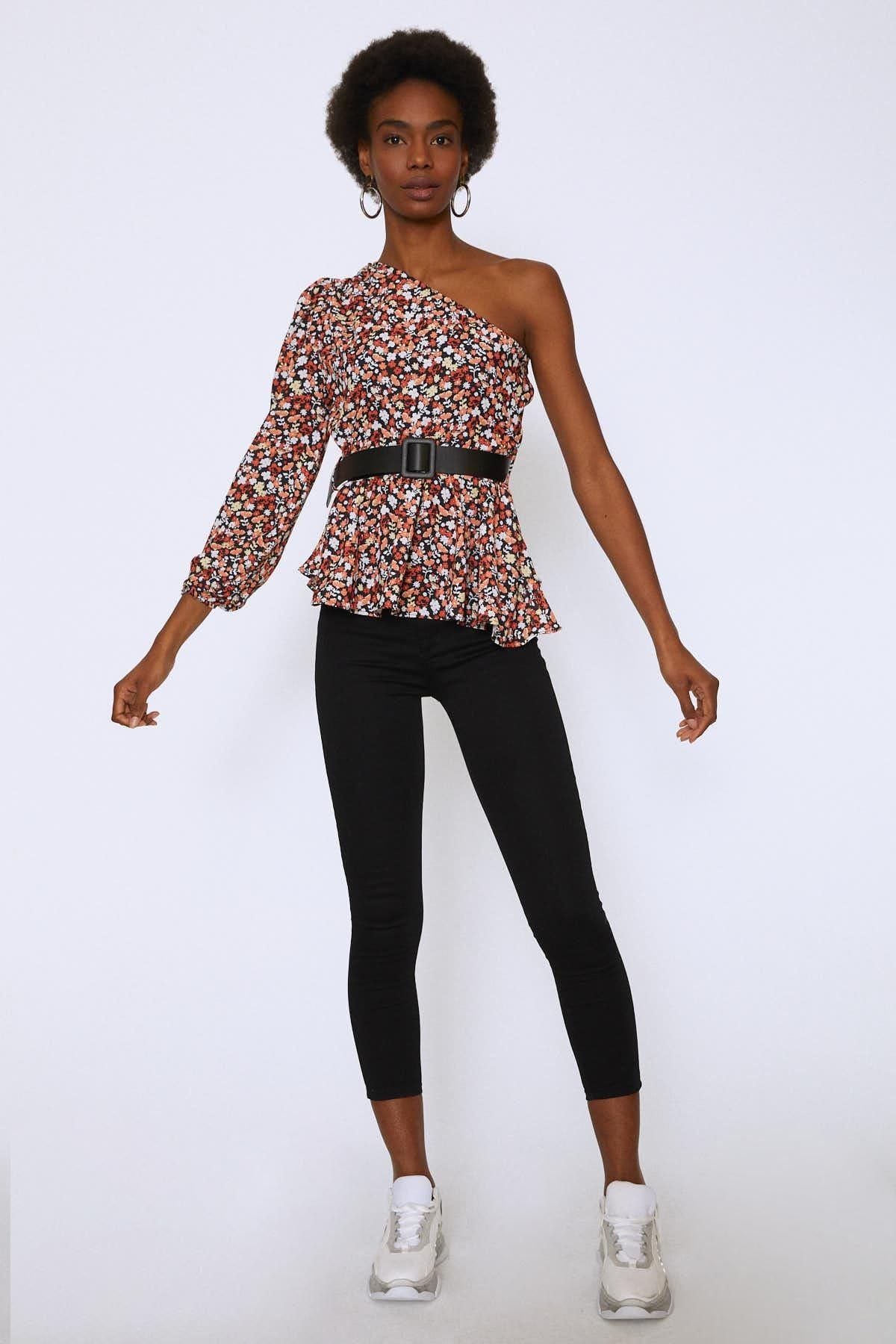Tek omuz modeli ile asimetrinin çekiciliğini ön plana çıkaran beli kemerli bluzu, skinny pantolon ve sneaker ayakkabılarla tamamlayabilirsin.