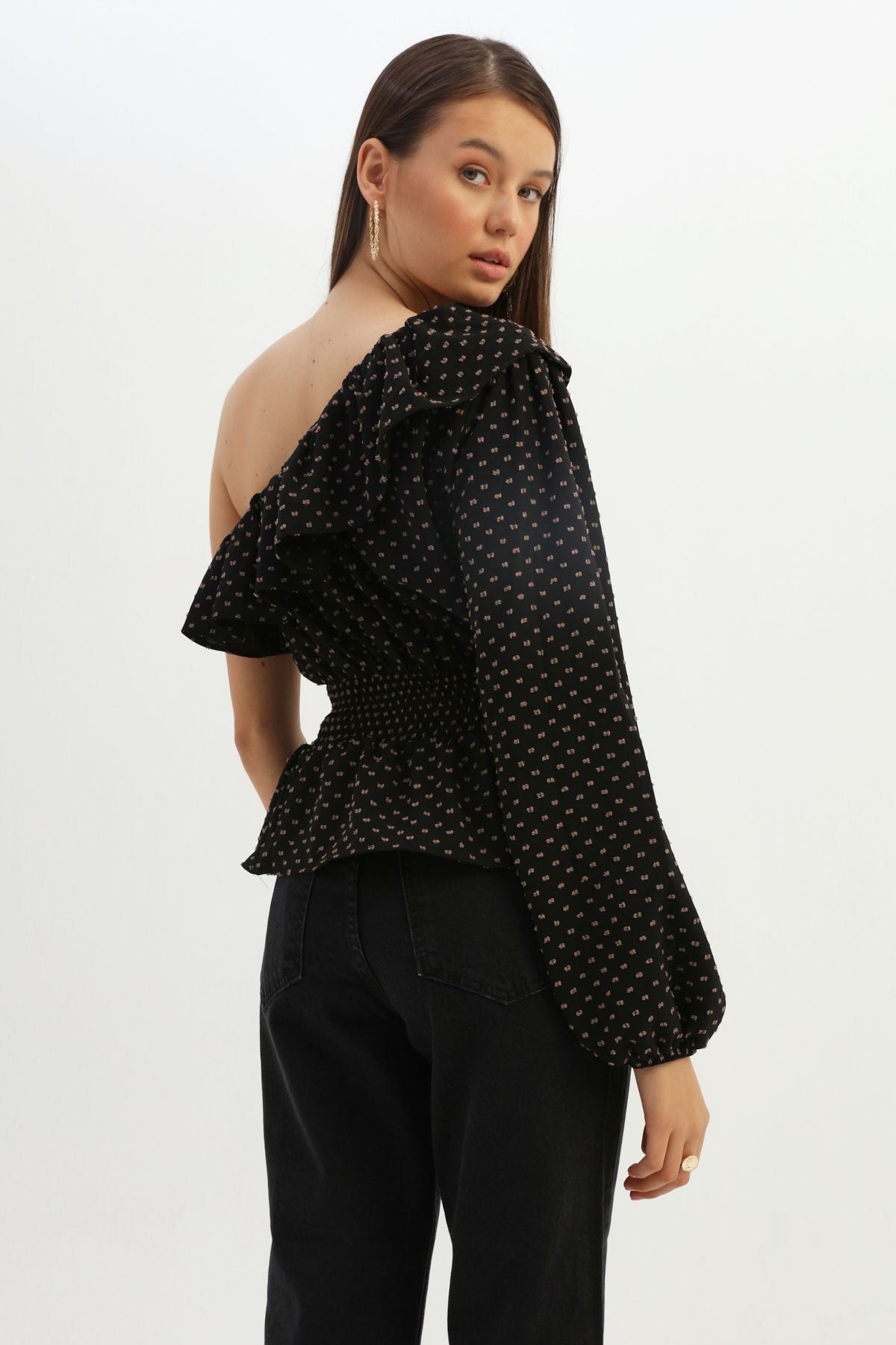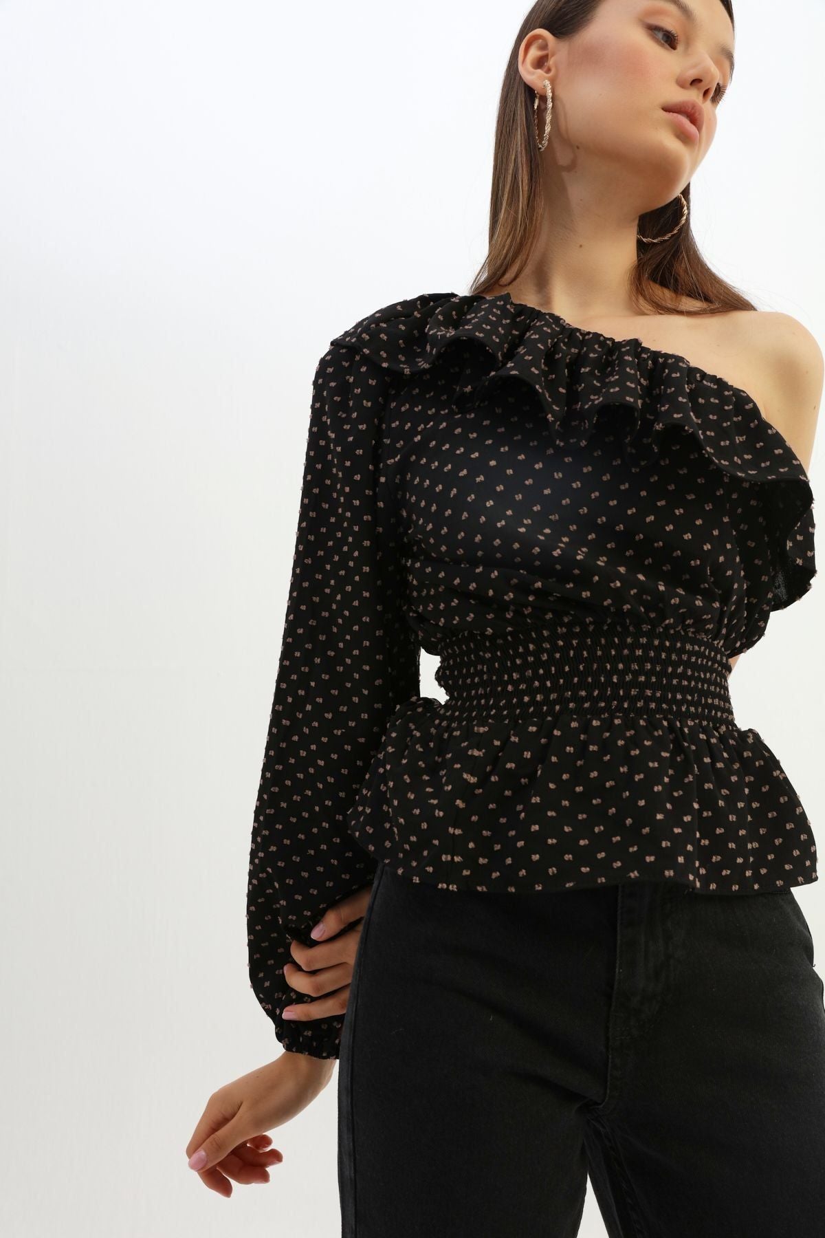 Volanlı Gipeli Tek Omuz Bluz Siyah