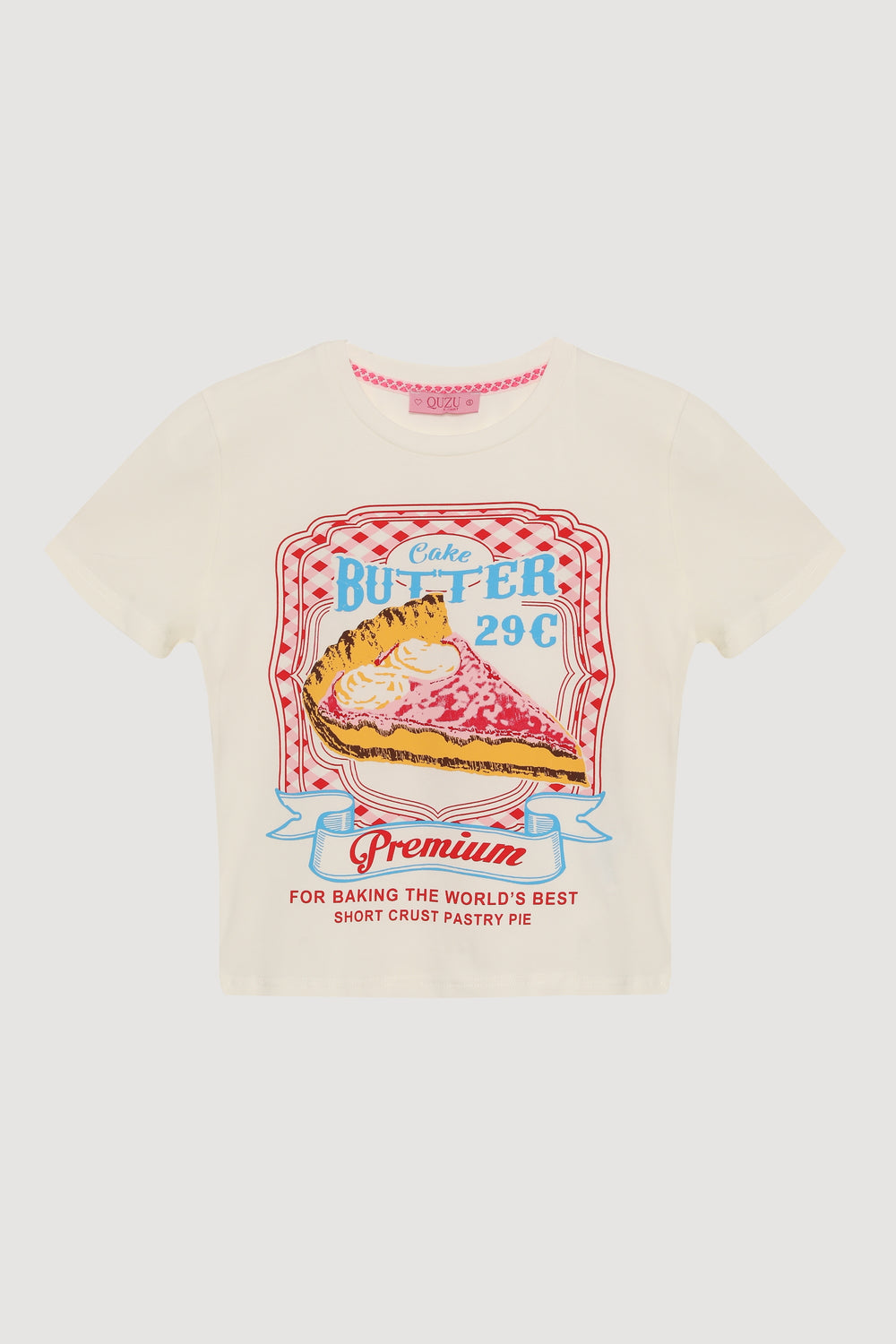 Biye Detaylı Yazı Baskılı Crop Tişört Ekru