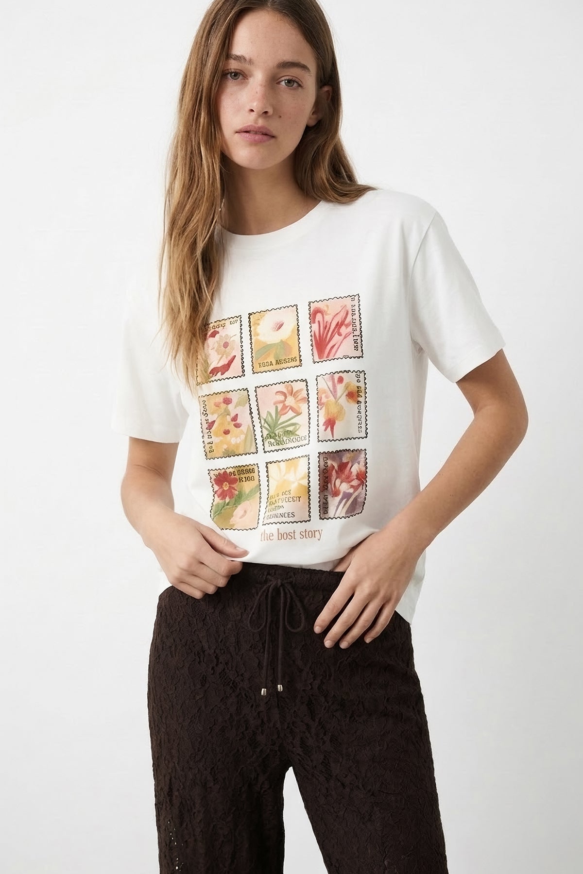 Çiçek Kolaj Baskılı Oversize Tişört Ekru