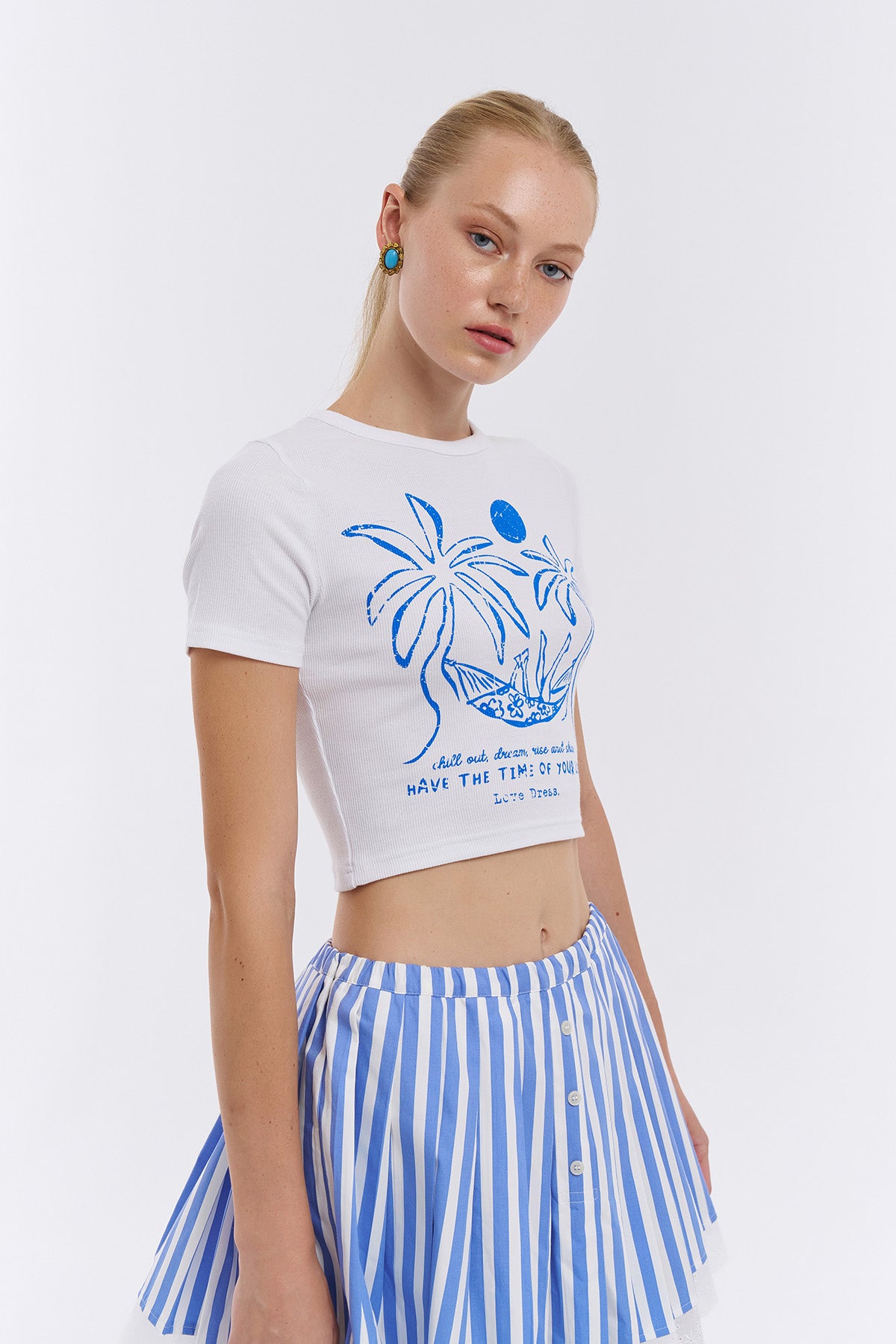 Palmiye Baskı Detaylı Crop Tişört Beyaz