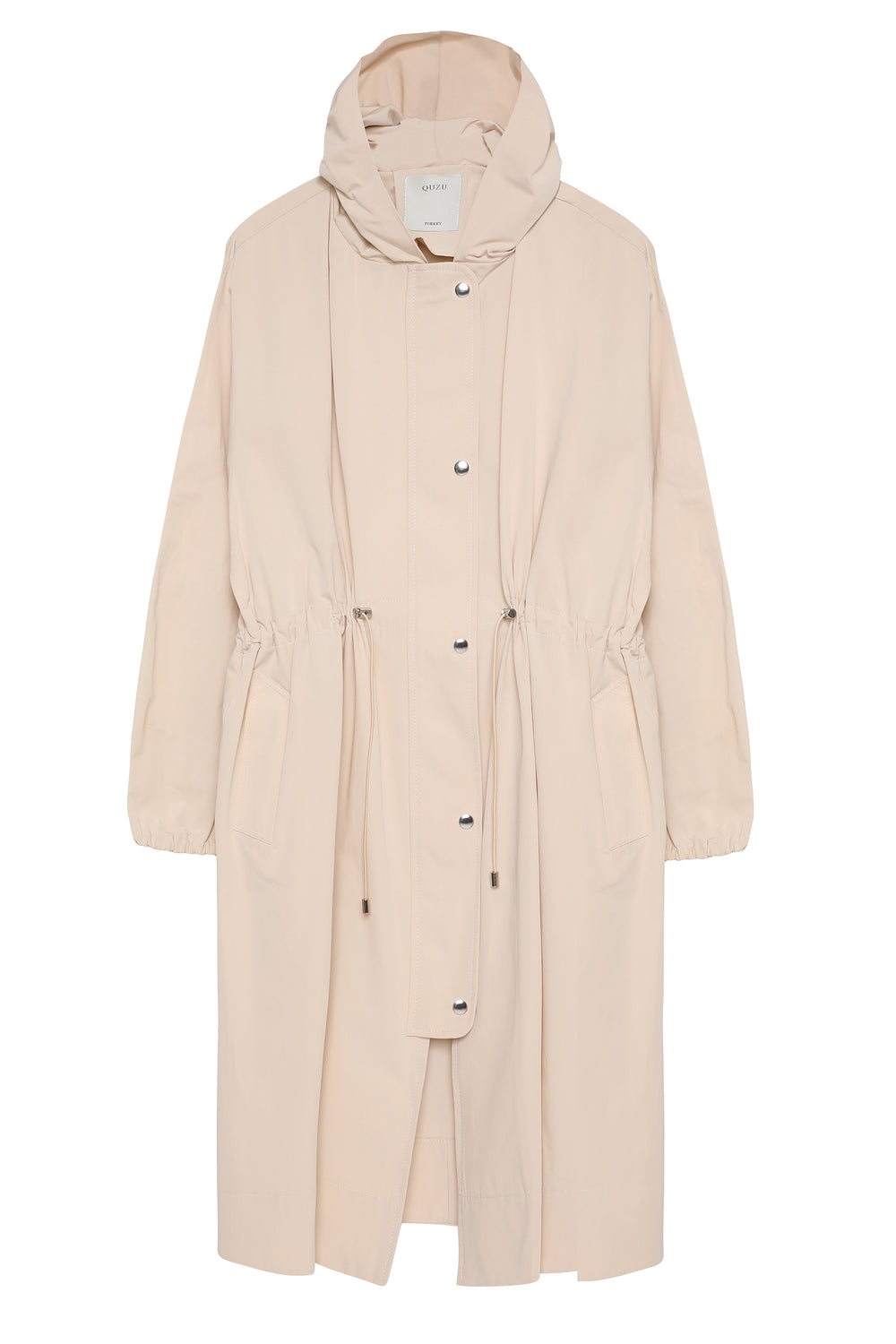 Pamuk karışımlı, kapüşonlu, çıtçıt düğmeli, beli büzgü detaylı, uzun kollu, çift cepli, teknik kumaş trençkot.