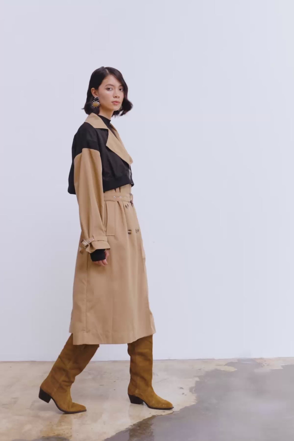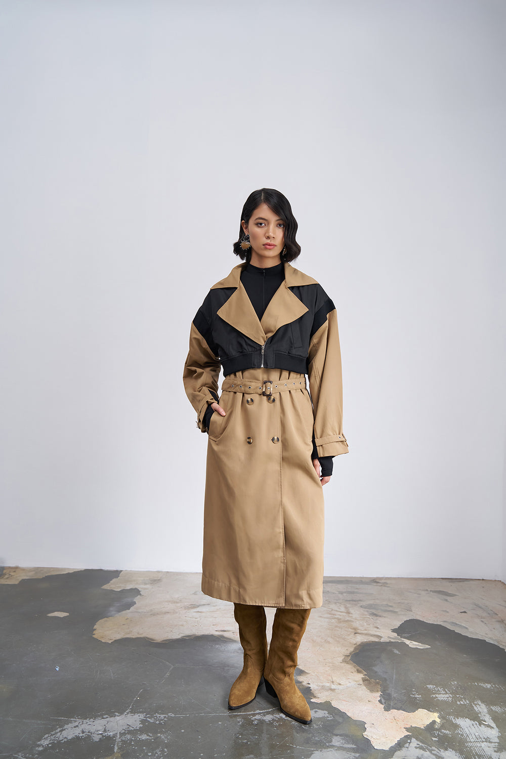 İçi astarlı, ön kısmı çift düğme detaylı, teknik kumaş matchli, kemerli ve uzun kollu trençkot.